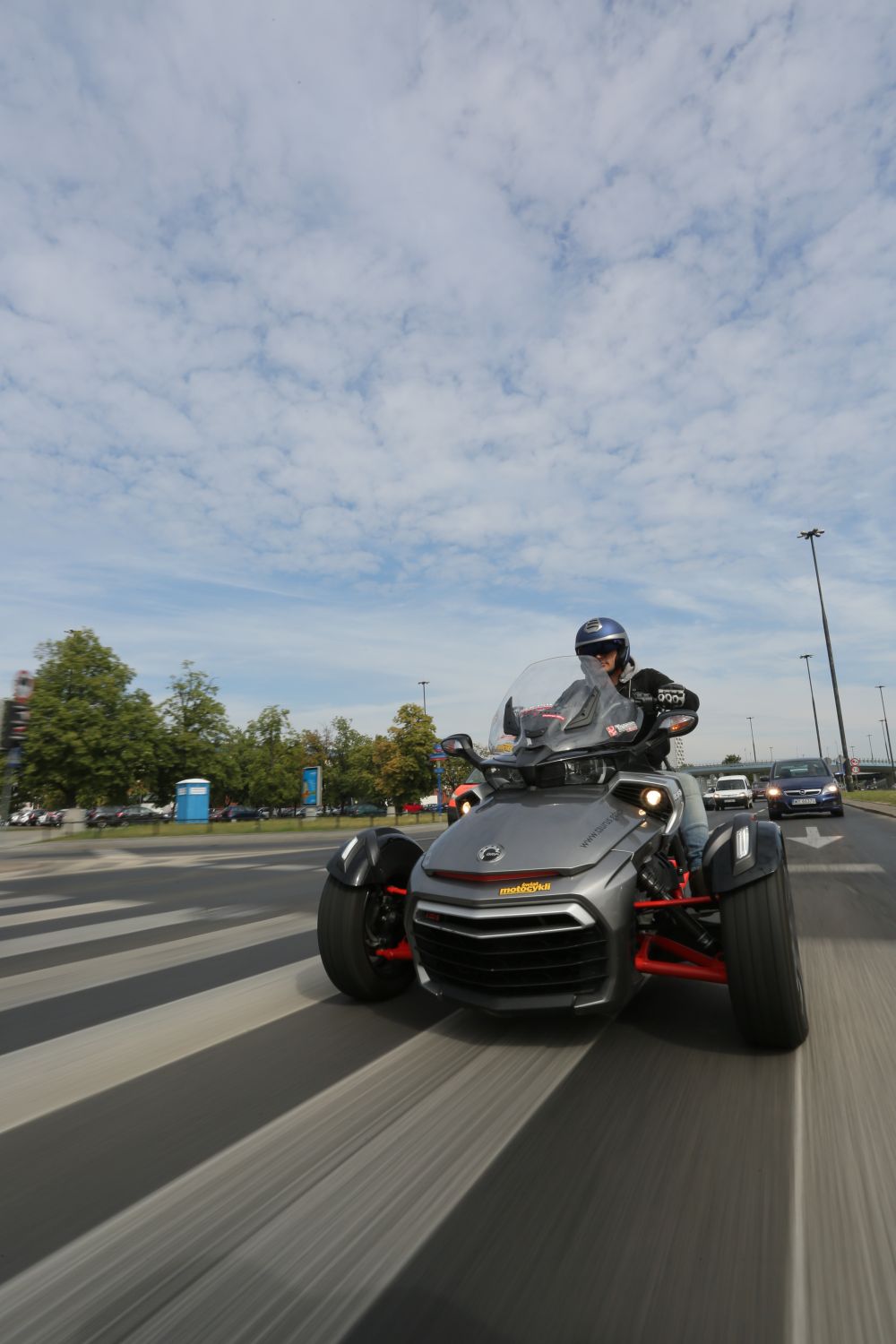 Przez blisko tydzień, każdego kolejnego dnia pokonywałem Spyderem kilkaset kilometrów. W korku utknąłem tylko raz, wyjeżdżając z Warszawy. W długiej trasie szybko zdałem sobie sprawę z faktu, że ten sprzęt, choć zwraca na siebie uwagę jak nic innego, wcale nie jest drogim gadżetem do lansu, tylko wygodnym turystykiem. Tak – turystykiem! Prędkość autostradowa około 160 km/h, włączony tempomat i komfortowa, zrelaksowana pozycja za kierownicą. Jeśli tylko pogoda dopisuje, połykasz kolejne kilometry szybko i wygodnie, łapiąc przy okazji wiatr we włosy. Z przodu jest bagażnik, więc można swobodnie zabrać najpotrzebniejsze rzeczy, a resztę wrzucić do plecaka. Model, którym jeździłem, to raczej typ cruisera, ale Spyder występuje też w wersji typowo turystycznej, z ogromną przestrzenią bagażową w centralnym i bocznych kufrach.