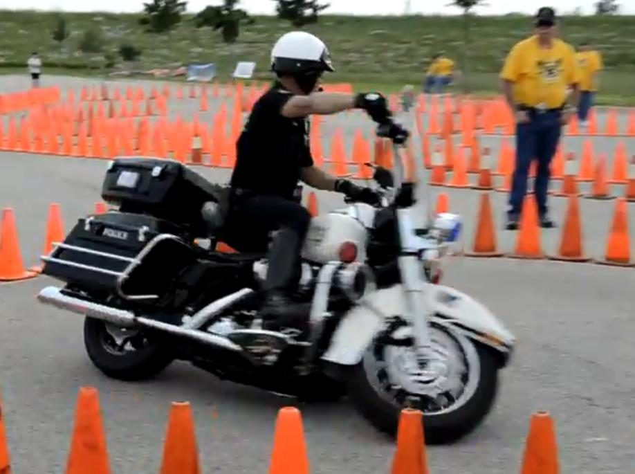 Ciekawe jak dziarski policjant radziłby sobie na lżejszym motocyklu w czasie jednej z polskich eliminacji Gymkhany.