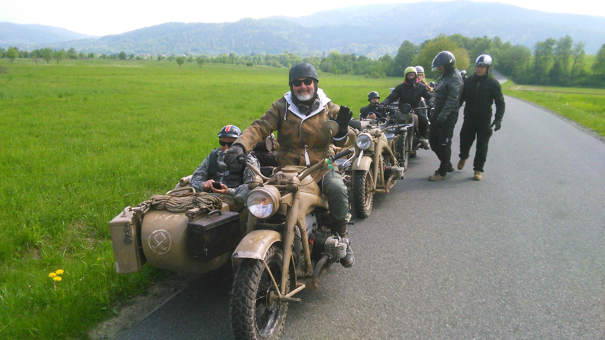 Na moje nieszczęście po drodze czekały mnie dwa odcinki dużo bardziej strome, ale o tym dowiedziałem się dopiero jak do nich dotarłem. Zjazd motocyklem, w którym skręcana rama dawno przestała być sztywna, brak podparcia na urwanym podnóżku dla nogi i bez hamulca na kole wózka nie był taki prosty jak mi się na początku wydawało. Motocykl żył swoim życiem, skręcając np. w zupełnie inną stronę niż bym tego od niego oczekiwał. Gdy dojechałem do bardziej stromych odcinków wiedziałem, że muszę zmienić technikę jazdy. Po pierwsze zgasiłem silnik dzięki czemu ten pracował jak skuteczny hamulec. Po drugie zjeżdżałem szusując zakosami, niczym na nartach, aby możliwie dużo wytracać z prędkości nabieranej przez ważący 450 kg pojazd. Gdy po półgodzinnej walce dojechałem do rozciągającej się u podnóża góry asfaltowej drogi, byłem mokry jak szczur i zmęczony jak koń po całodziennej orce. Żal jednak było w sercu tego, że nie zobaczyłem szczytu gór z bliska. Racząc się zimnym piwem czekałem z nadzieją, że może któryś z uczestników po zjeździe z Hali Miziowej zajedzie na bazę. Na moje szczęście tak się stało i Karol z Gdańska zabrał mnie na siodełko pasażera w swoim Zündappie KS 750. A na ten dzień przewidziane było jeszcze zwiedzanie „Muzeum Motóra” w Korbielowie oraz wycieczka do Żywieckiego Browaru. Na bazę mieliśmy wrócić ok. 19. Bardzo się ucieszyłem, że dane mi będzie zobaczyć pozostałe na ten dzień zaplanowane atrakcje.