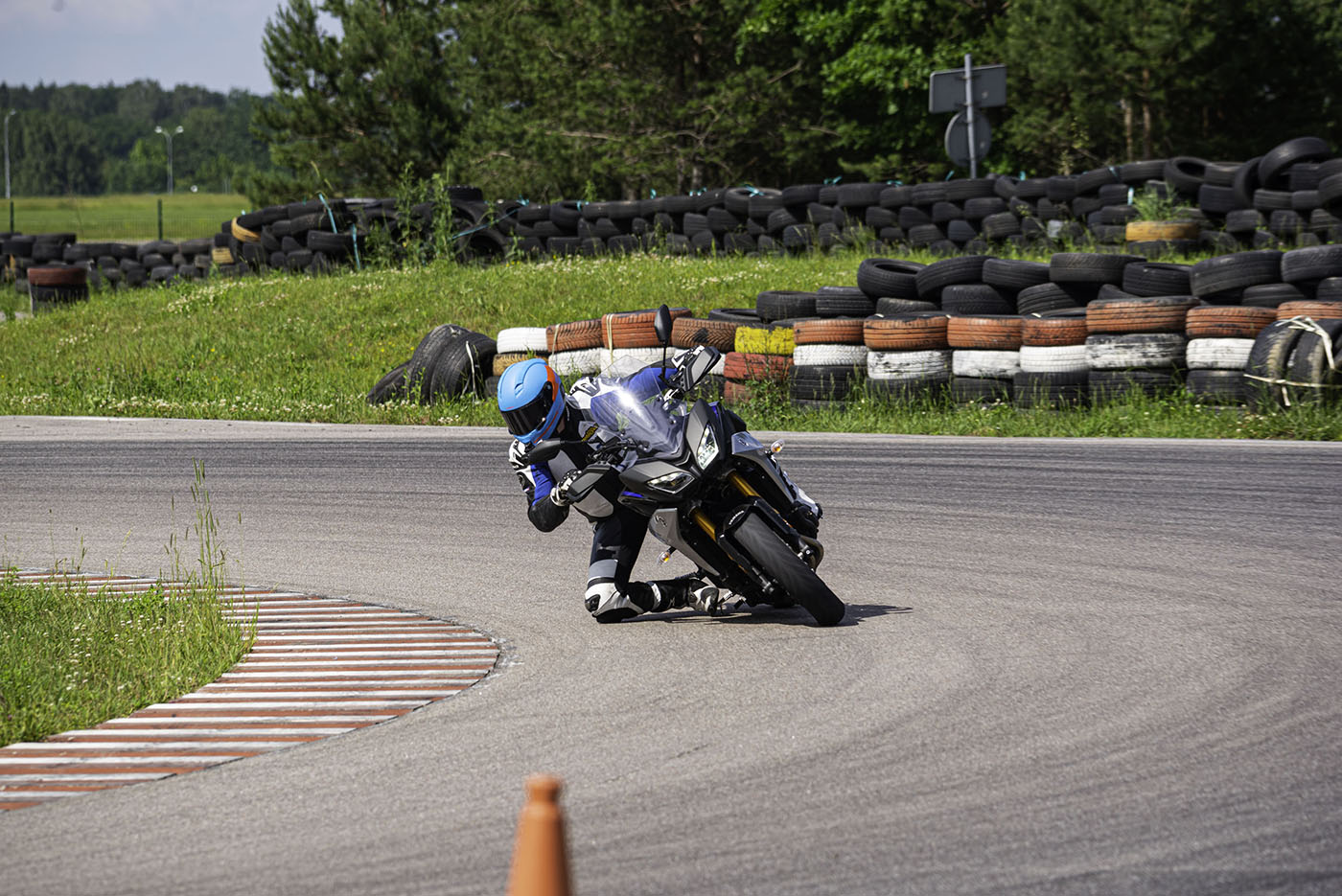 Na torze spotkamy też wiele maszyn o większej pojemności. Na motocyklach powyżej 600., a nawet 1000ccm będziecie bawić się nie gorzej, tyle że nie będziecie musieli zmieniać biegów. Tor w Białymstoku to jeden z niewielu obiektów na którym możemy jeździć motocyklem po „ryflach”. To strefy znajdujące się na zewnętrznych stronach wejścia i wyjścia z zakrętów, oraz po wewnętrznych stronach łuków. Są wystarczająco równe i przyczepne, żeby po nich jechać przy ścinaniu szykan. Trzeba jednak robić to z dużym wyczuciem i nie w pełnym złożeniu, ponieważ ich przyczepność jest znacznie niższa, niż asfaltu.