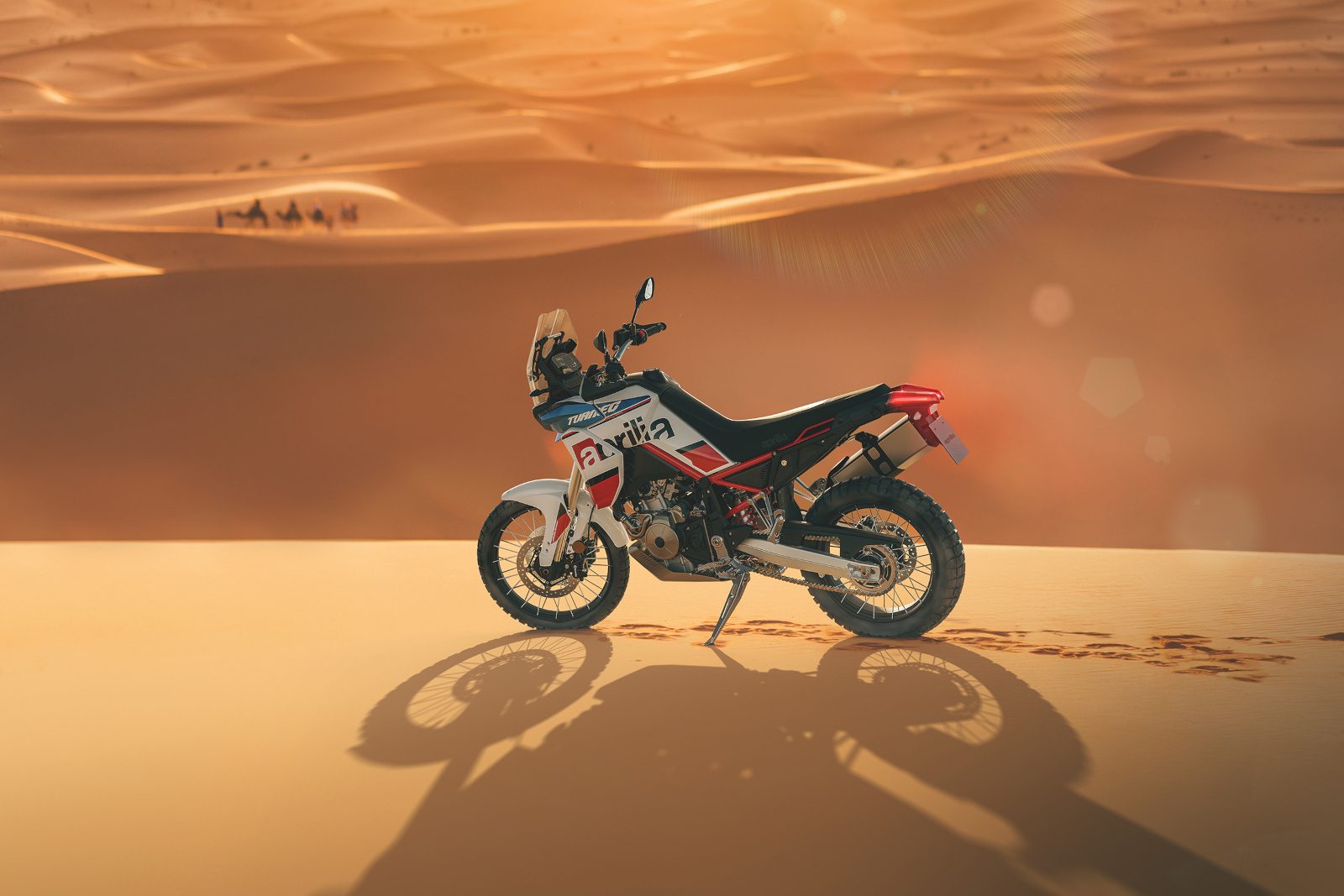 Wszystkie nowe kolory połączono z zupełnie nową, agresywną czerwoną ramą. Zabieg ten dodatkowo podkreśla sportowy charakter Aprilii Tuareg, bohaterki tegorocznego zaskakującego debiutu w rajdach terenowych w ramach projektu „Back to Africa”. Maszyna, w wersji opracowanej przez Aprilia Racing we współpracy z GCorse braci Guareschi, jest obecnie bliska zdobycia tytułu w Motocyklowych Rajdowych Mistrzostwach Włoch. Ponadto jest świeżo po wywalczeniu wspaniałego trzeciego miejsca w rajdzie Transanatolia Rally, będącym jej absolutnym debiutem w wielkiej międzynarodowej imprezie. Kolejnym krokiem w tym projekcie jest oczywiście afrykańska pustynia. To cel, który jest już zapisany w samej nazwie Tuareg.