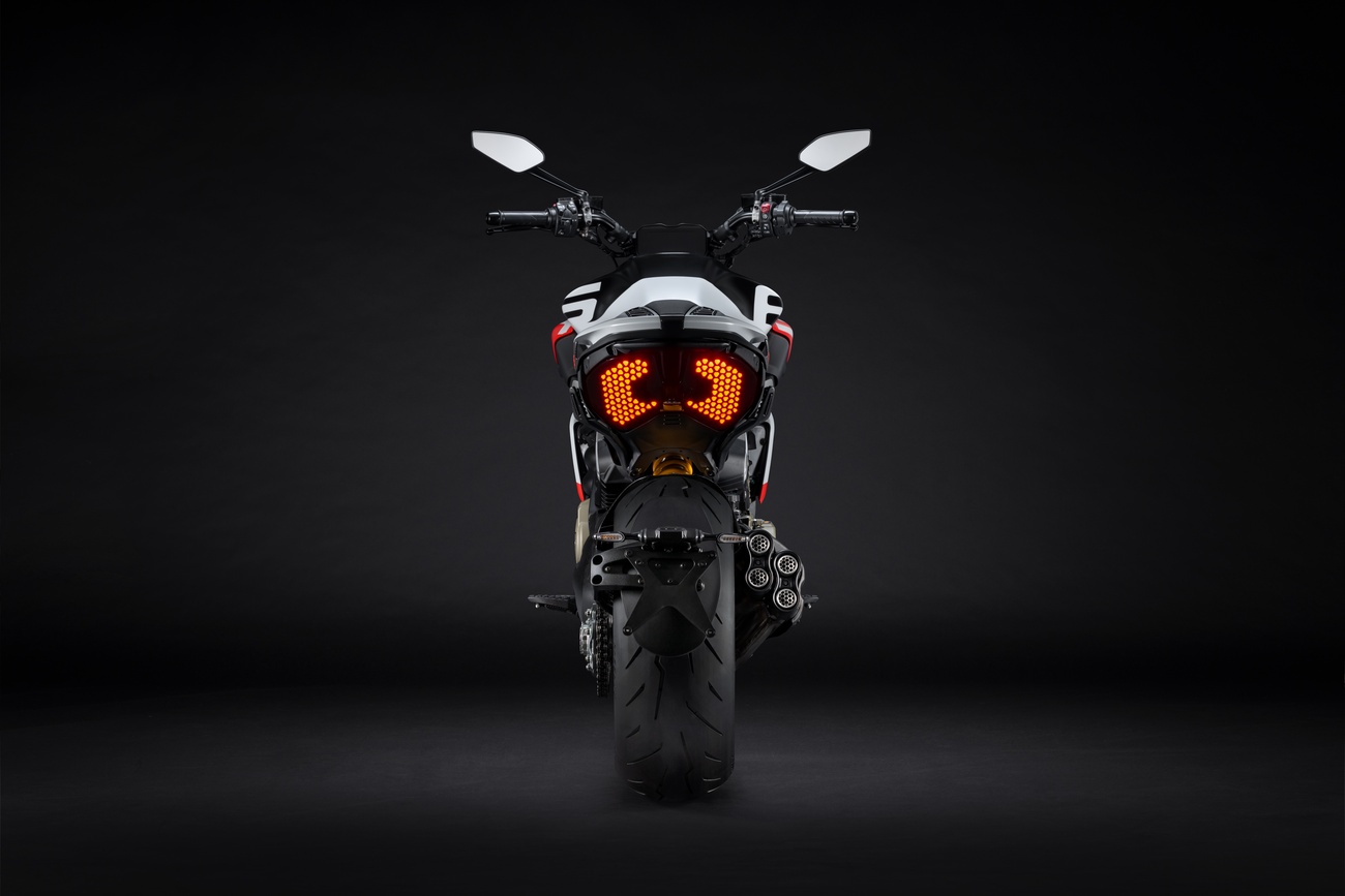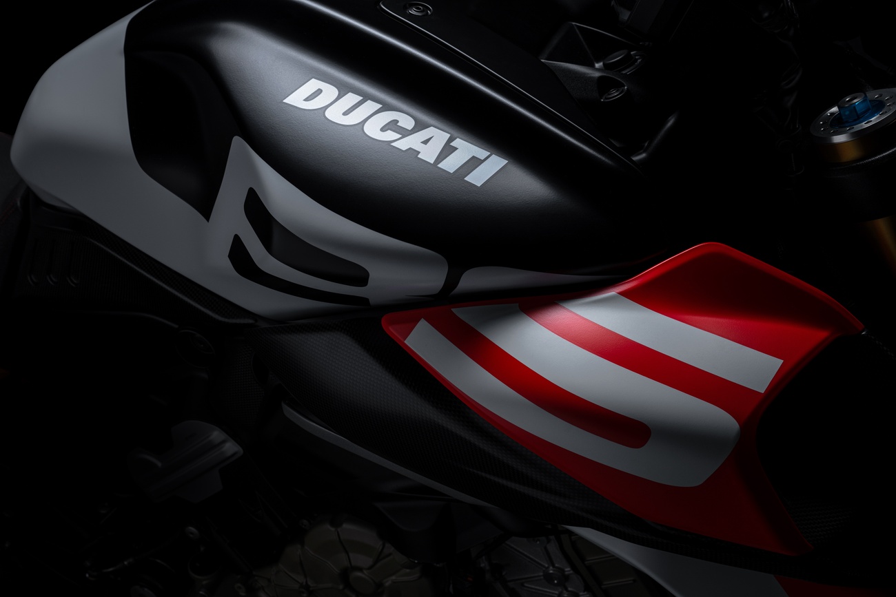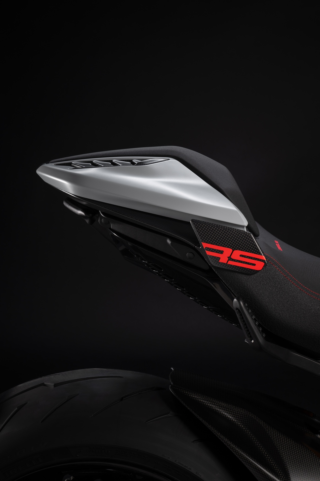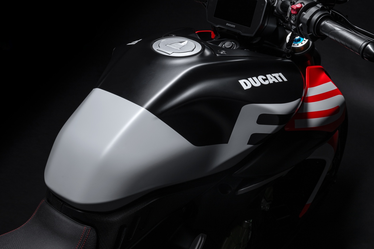 Techniczne i stylistyczne detale czynią Diavela V4 RS unikalnym. Zaprojektowane przez Centro Stile Ducati logo RS pojawia się w dedykowanym malowaniu, na kluczyku, a także w animacji wyświetlanej podczas uruchomienia zapłonu. Diavel V4 RS ma zupełnie nowy design, ale zachował swoją niepowtarzalną tożsamość. Elementy wykonane z włókna węglowego przyczyniają się do jeszcze bardziej wyjątkowego i sportowego wyglądu, redukując wagę motocykla o 3 kilogramy.