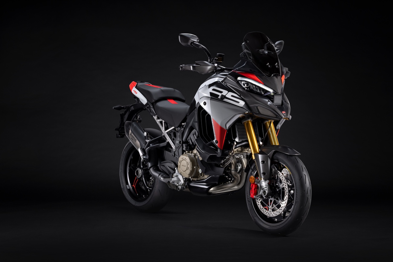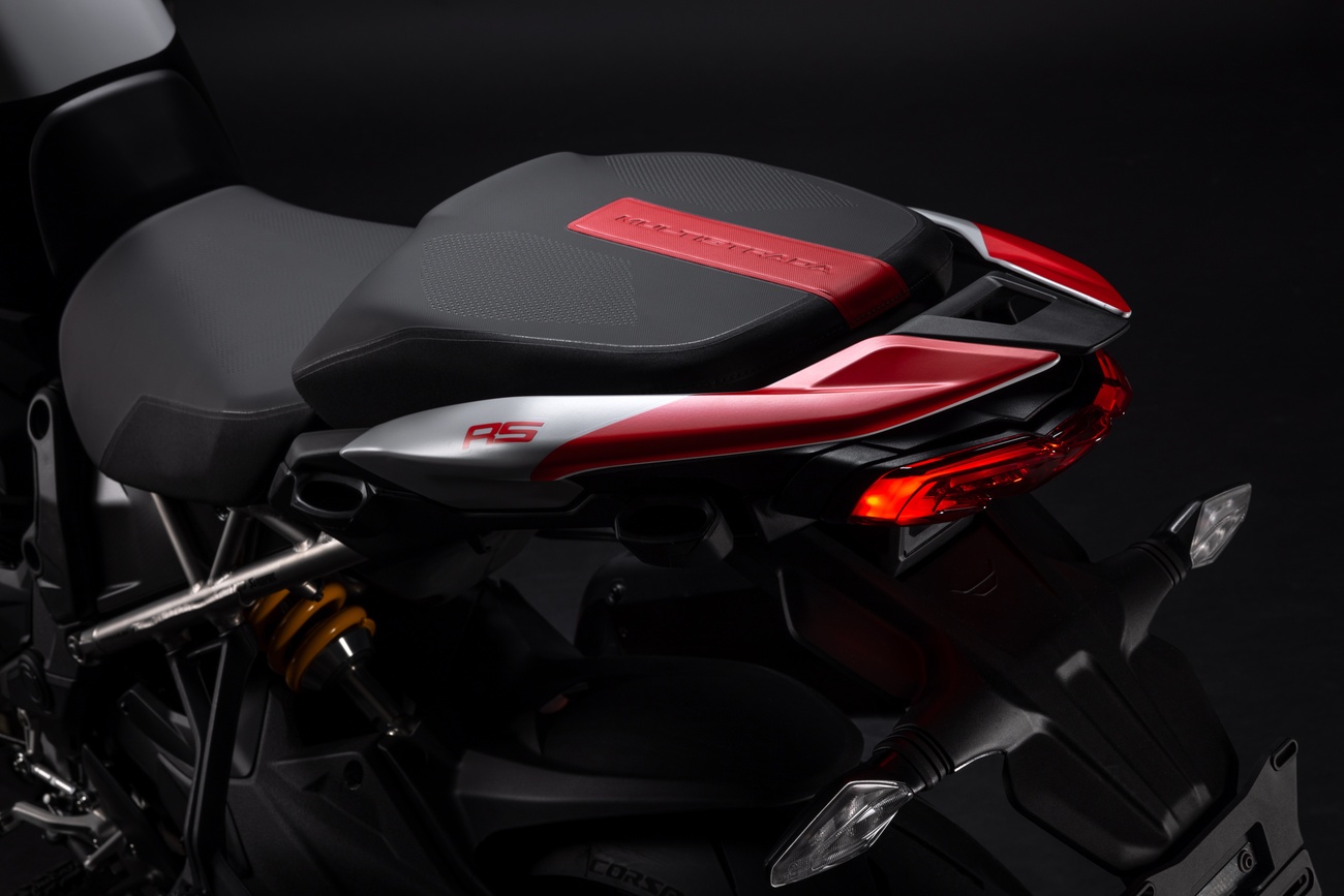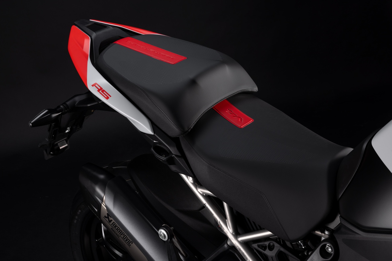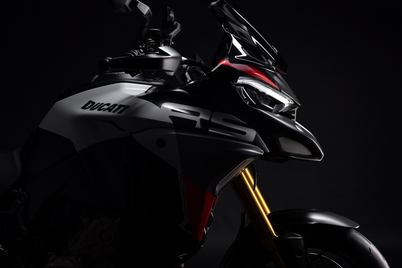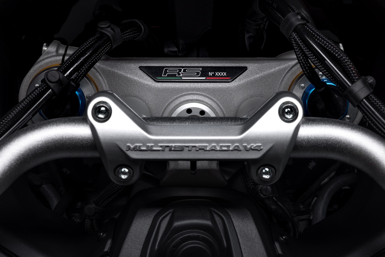 Multistrada V4 RS łączy niepowtarzalną linię Multistrady, elegancką i dynamiczną, z nowym malowaniem RS. Liczne elementy z włókna węglowego, takie jak przedni błotnik, osłony dłoni, osłony termiczne i przedni dziób, a także kute koła, lekki akumulator litowo-jonowy i technopolimerowy ogon zamontowany na tytanowej ramie pomocniczej, przyczyniają się do oszczędności masy o 2 kg w porównaniu z Multistradą V4 Pikes Peak.