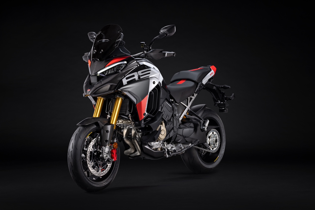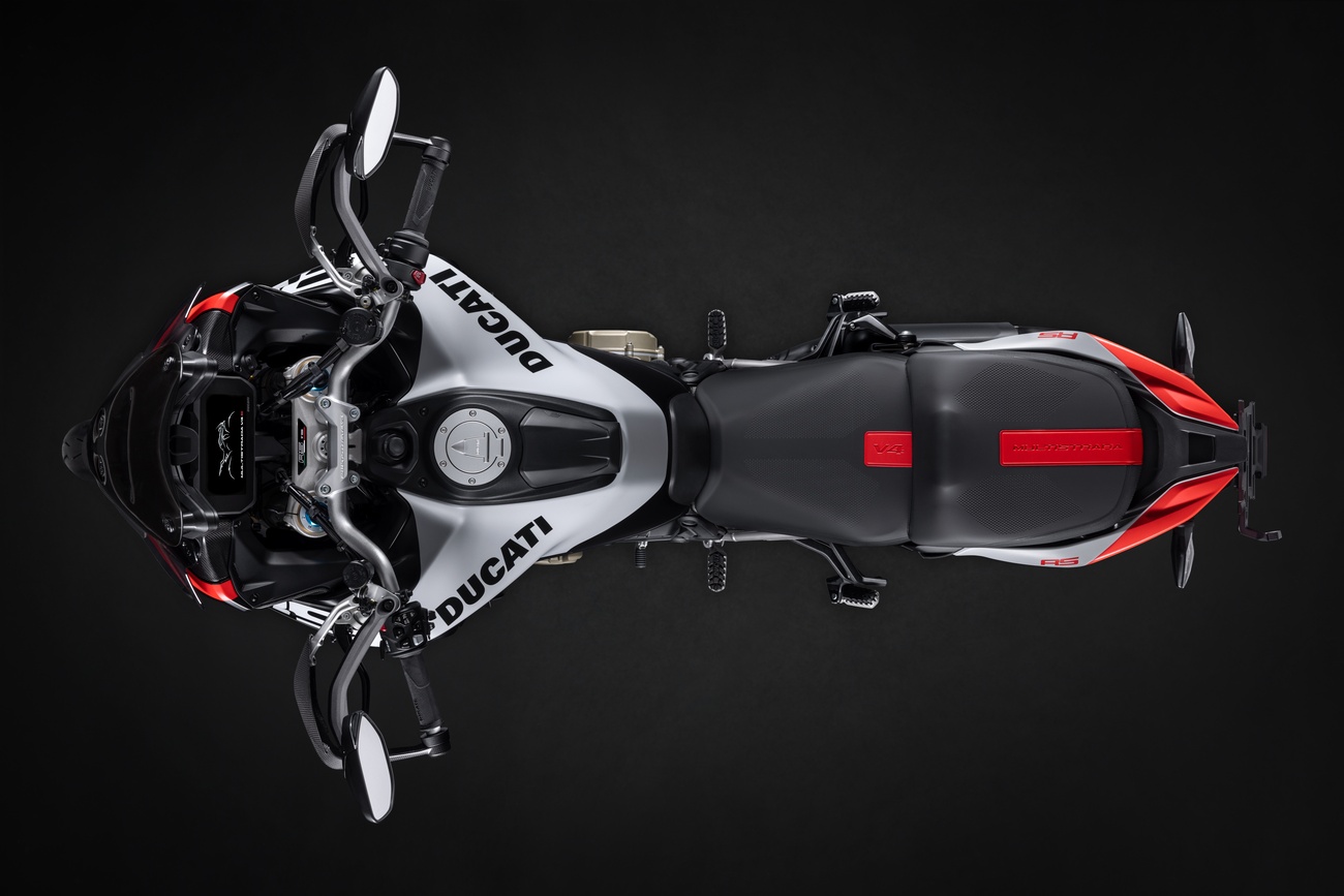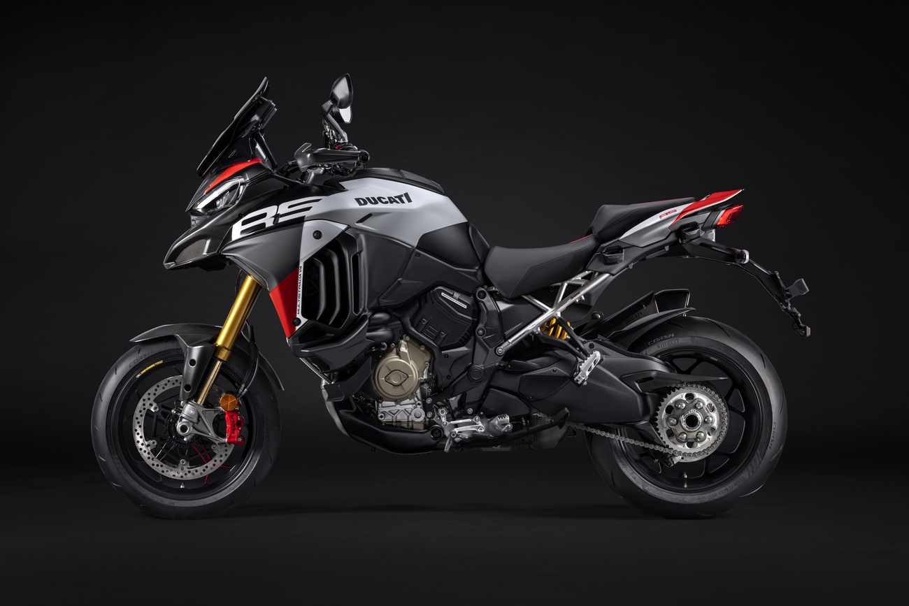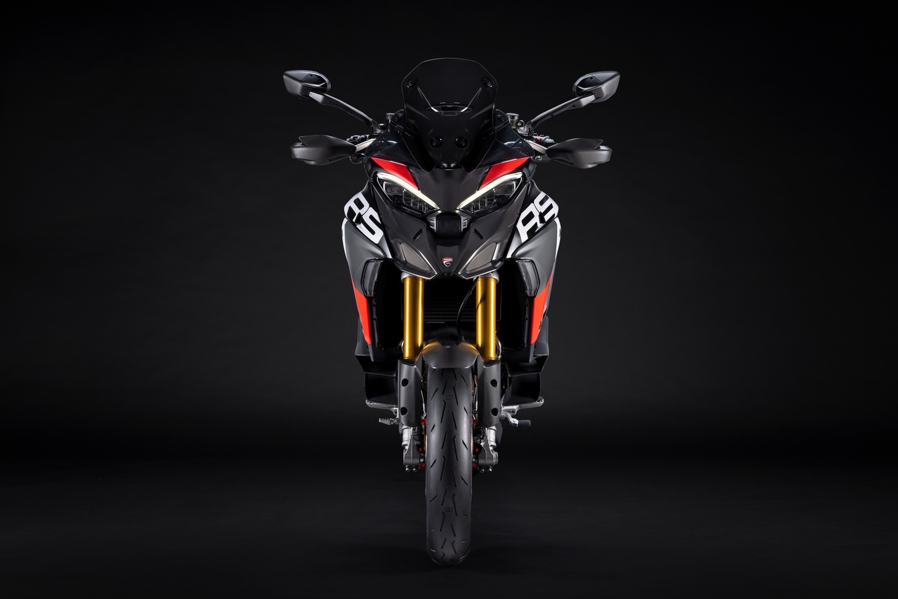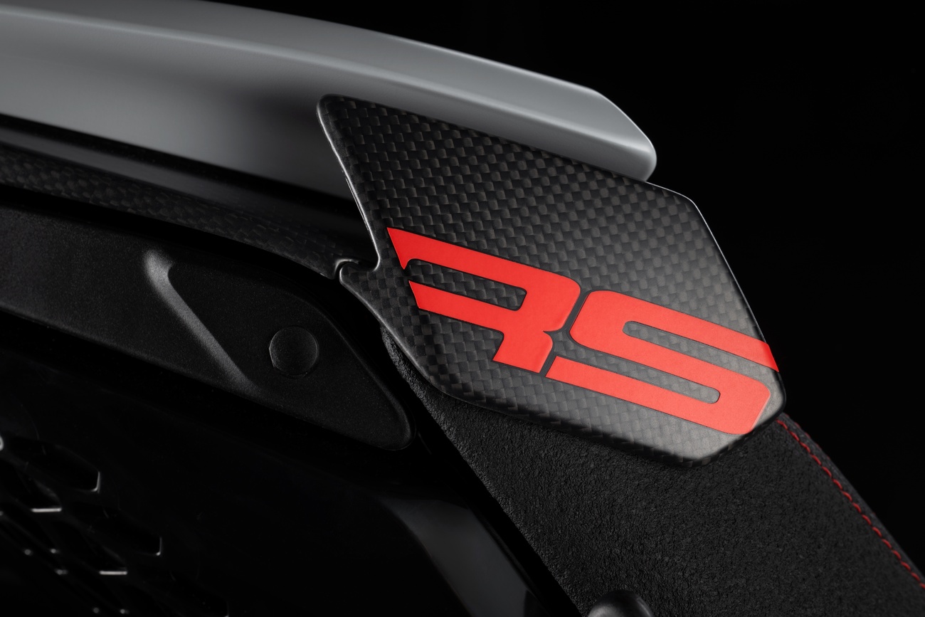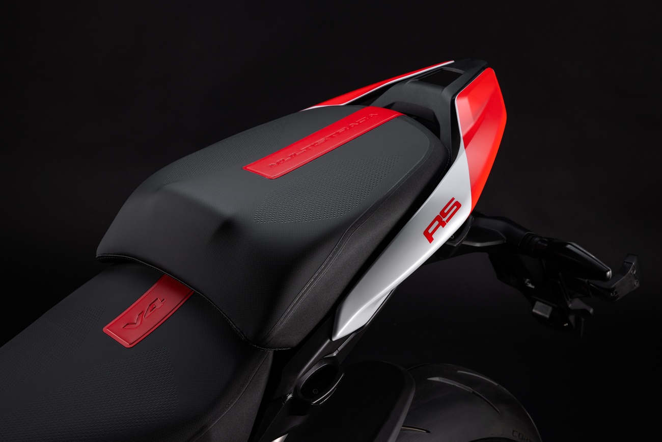Multistrada V4 RS łączy niepowtarzalną linię Multistrady, elegancką i dynamiczną, z nowym malowaniem RS. Liczne elementy z włókna węglowego, takie jak przedni błotnik, osłony dłoni, osłony termiczne i przedni dziób, a także kute koła, lekki akumulator litowo-jonowy i technopolimerowy ogon zamontowany na tytanowej ramie pomocniczej, przyczyniają się do oszczędności masy o 2 kg w porównaniu z Multistradą V4 Pikes Peak.