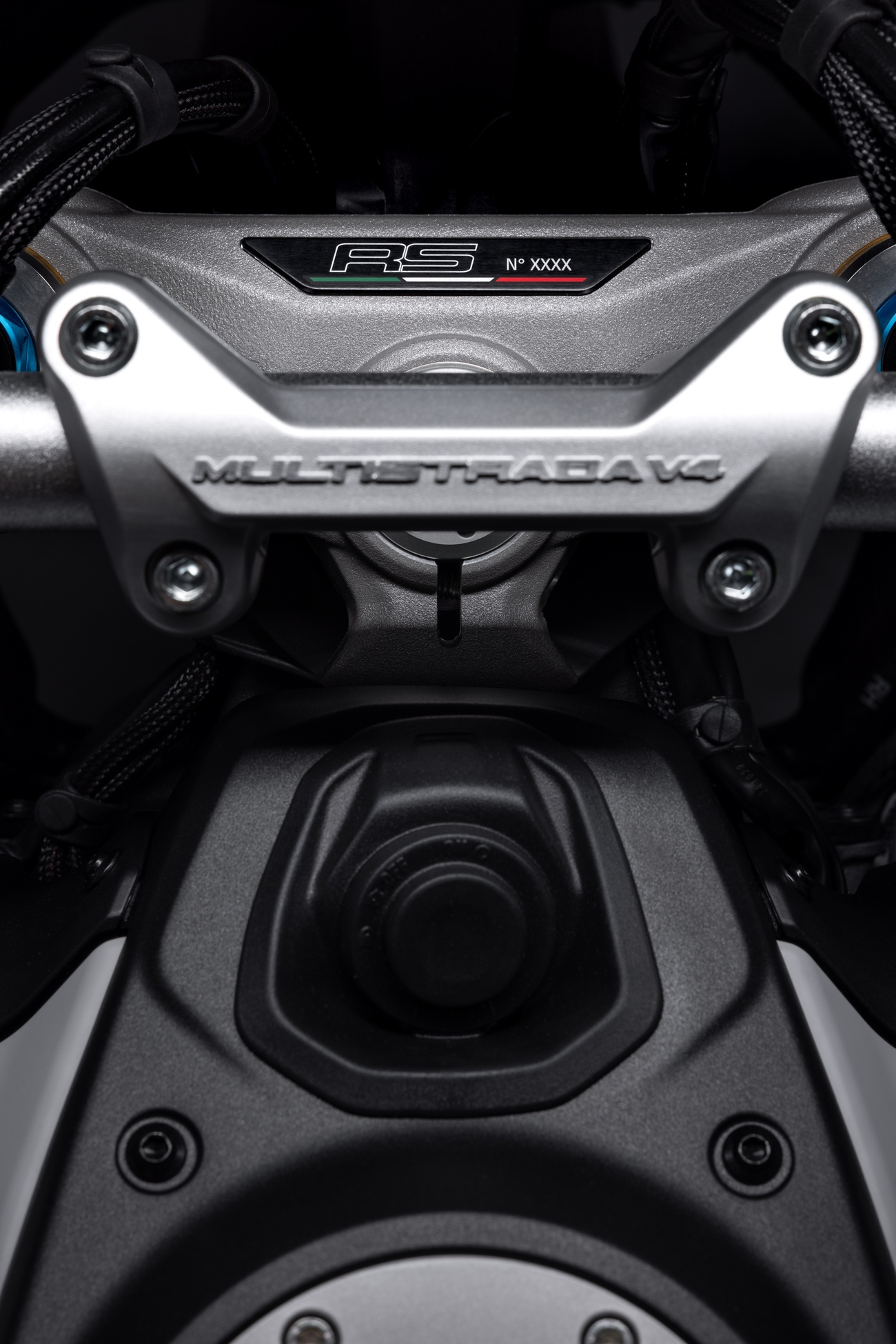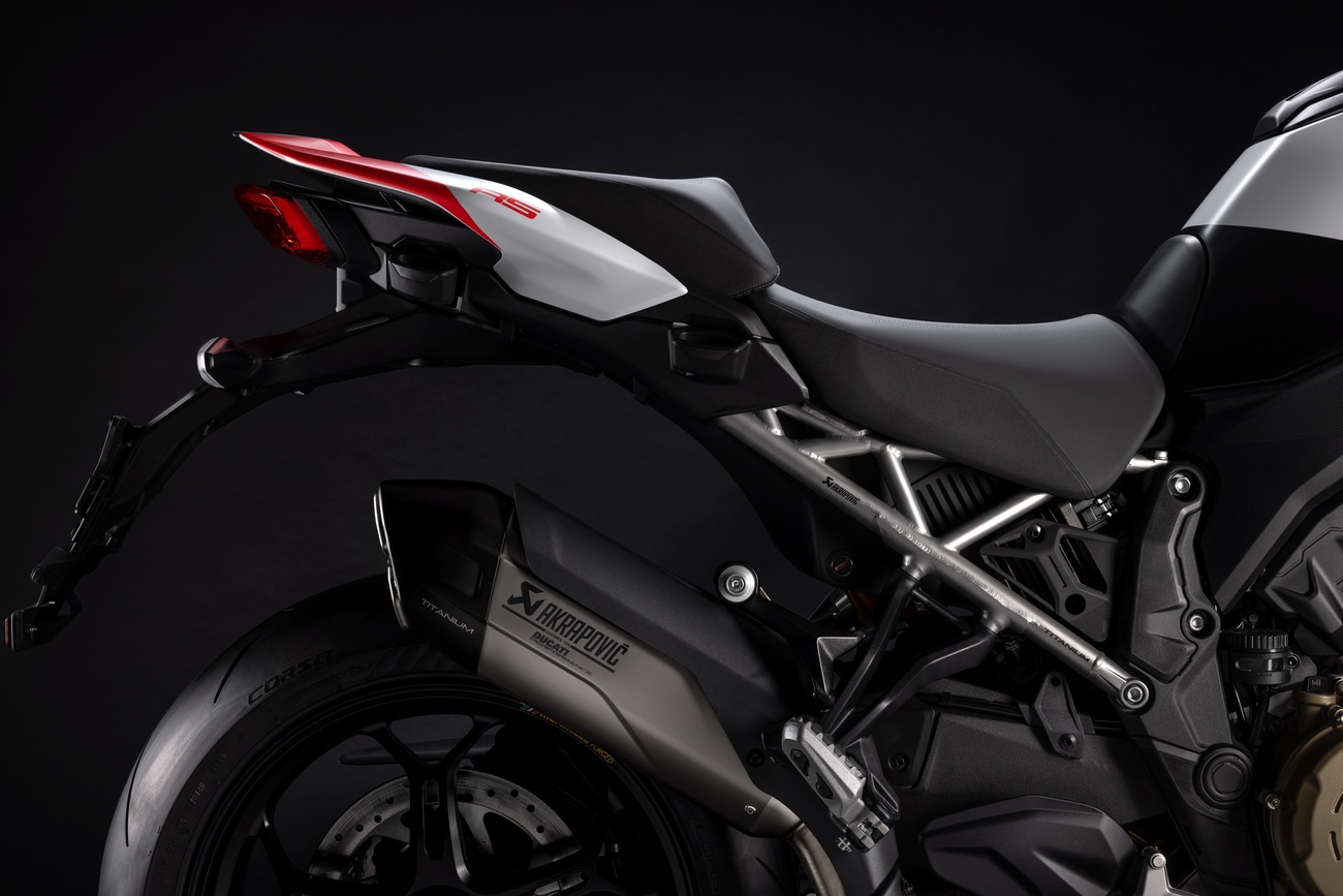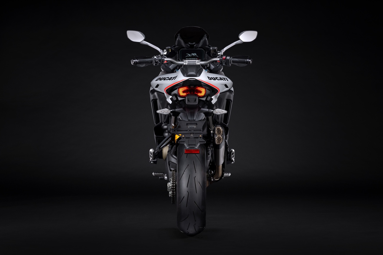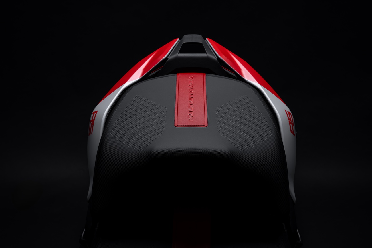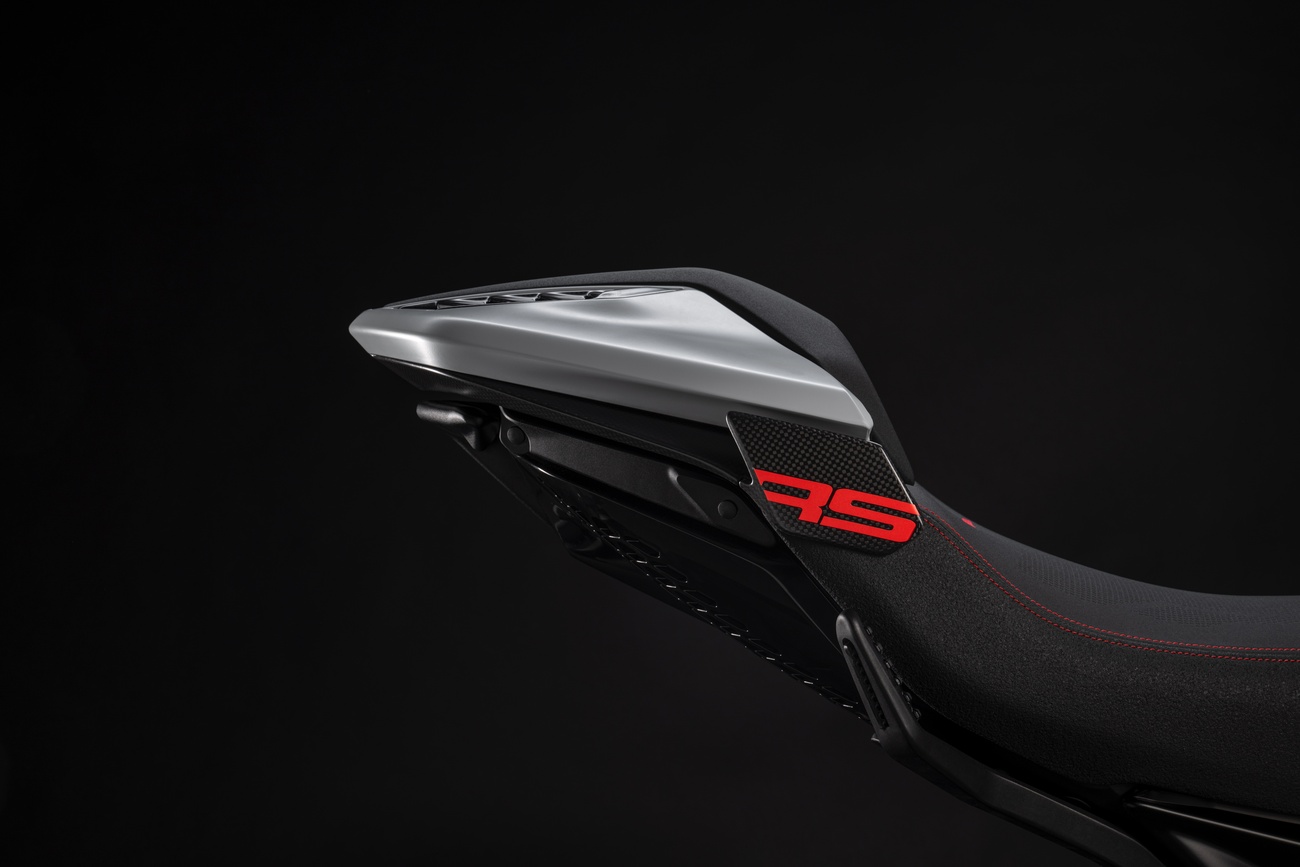 Multistrada V4 RS łączy niepowtarzalną linię Multistrady, elegancką i dynamiczną, z nowym malowaniem RS. Liczne elementy z włókna węglowego, takie jak przedni błotnik, osłony dłoni, osłony termiczne i przedni dziób, a także kute koła, lekki akumulator litowo-jonowy i technopolimerowy ogon zamontowany na tytanowej ramie pomocniczej, przyczyniają się do oszczędności masy o 2 kg w porównaniu z Multistradą V4 Pikes Peak.