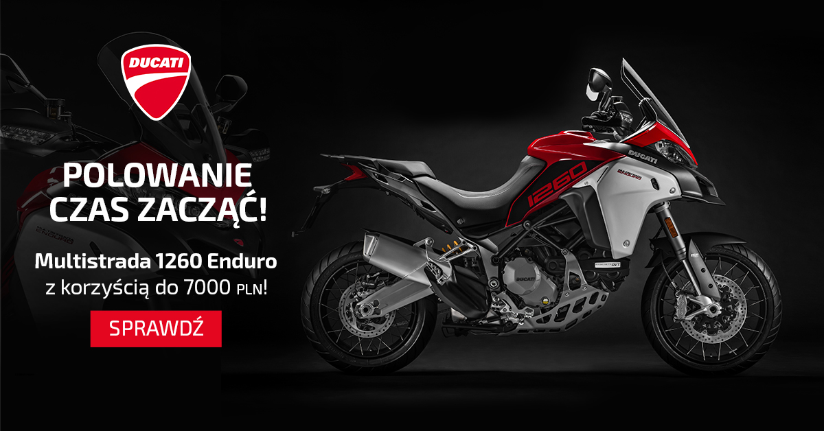 Zdecydowanie największą okazją podczas wyprzedaży rocznika 2020 jest Multistrada 1260 Enduro. Wyprawowy motocykl, zaprezentowany w 2019 roku, wyposażono w silnik ze zmiennymi fazami rozrządu Testastretta DVT o pojemności 1262 ccm. Jednostka legitymuje się mocą 158 KM i maksymalnym momentem obrotowym 128 Nm. Razem z fenomenalnymi osiągami otrzymasz w pakiecie najnowocześniejsze systemy elektroniczne, wspaniałą ergonomię i dopracowane podwozie, w którym nie brakuje zawieszenia i hamulców z najwyższych półek. Tylko teraz możesz kupić Multistradę 1260 Enduro aż 7000 zł taniej!