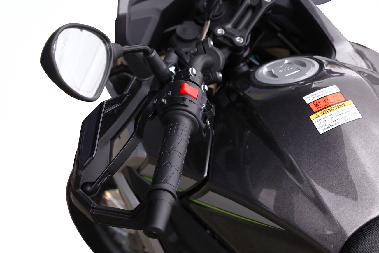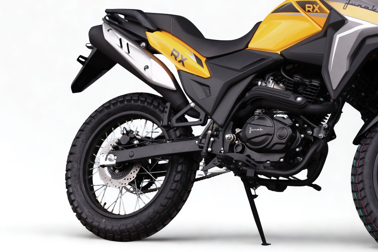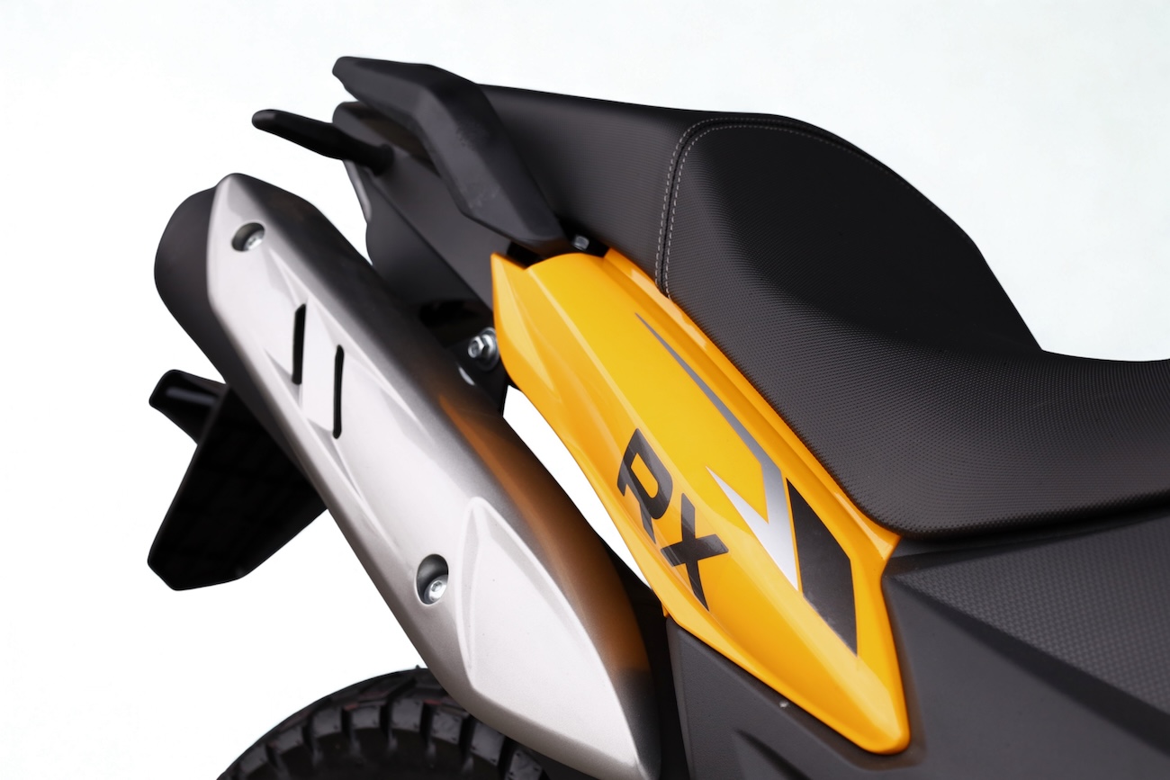 Już na pierwszy rzut oka RX 125 ABS zdradza swoje terenowe DNA – muskularne proporcje i dynamiczne linie podkreślają jego gotowość do działania. Szprychowe koła o średnicy 19 cali z przodu i 17 z tyłu, wysoki prześwit wynoszący 245 mm oraz odpowiednio zestrojone zawieszenie zapewniają pewność prowadzenia nawet wtedy, gdy asfalt zamienia się w szuter.