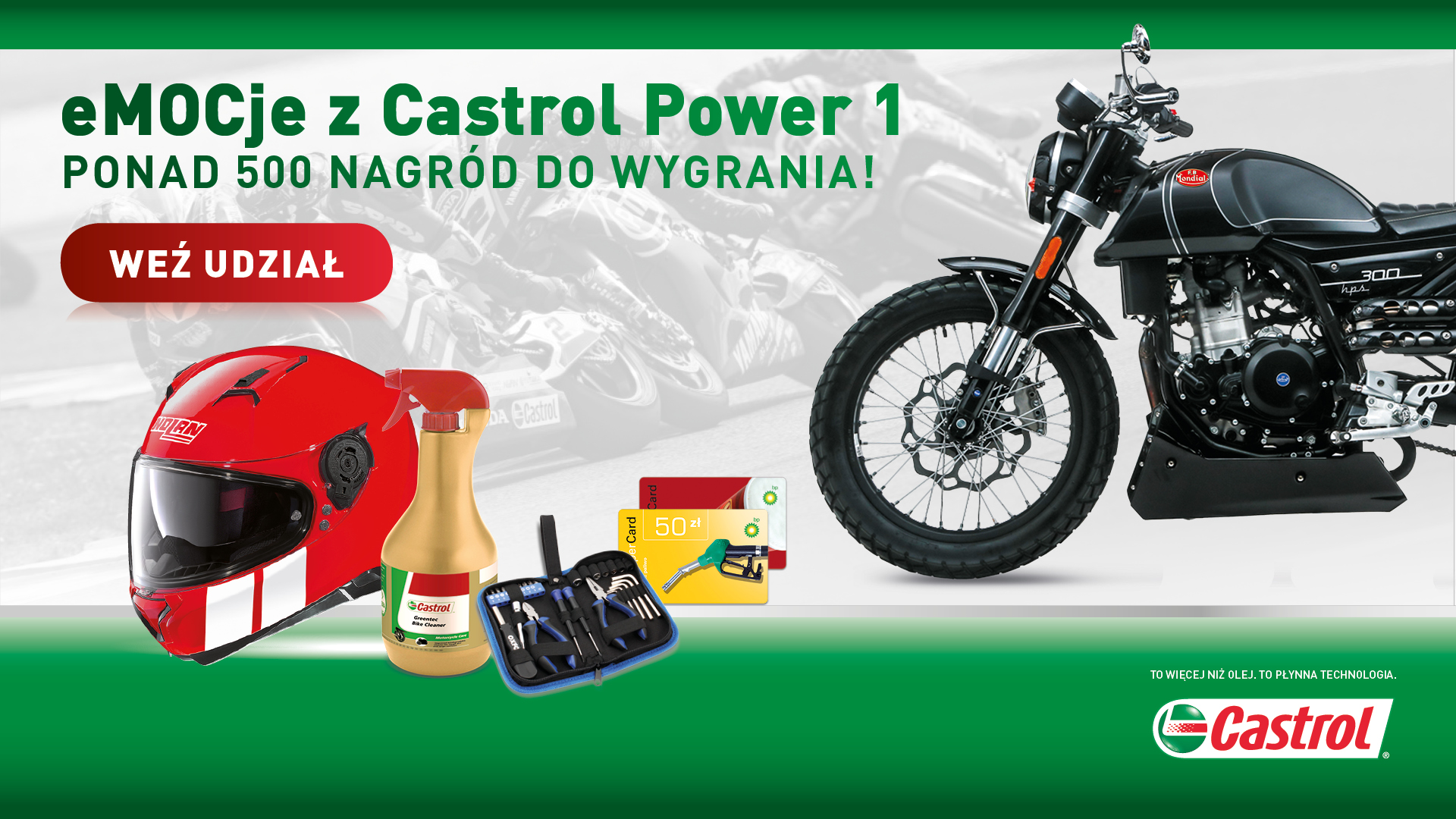 Dwa, piękne motocykle Mondial HPS 300, 20 kasków Nolan i setki drobniejszych gadżetów: środki do pielęgnacji motocykla, zestawy narzędzi oraz karty paliwowe i podarunkowe na stacjach BP – to nagrody, które skuszą każdego motocyklistę. Przyciągnęliśmy Twoją uwagę? Co do tego nie mamy najmniejszej wątpliwości!