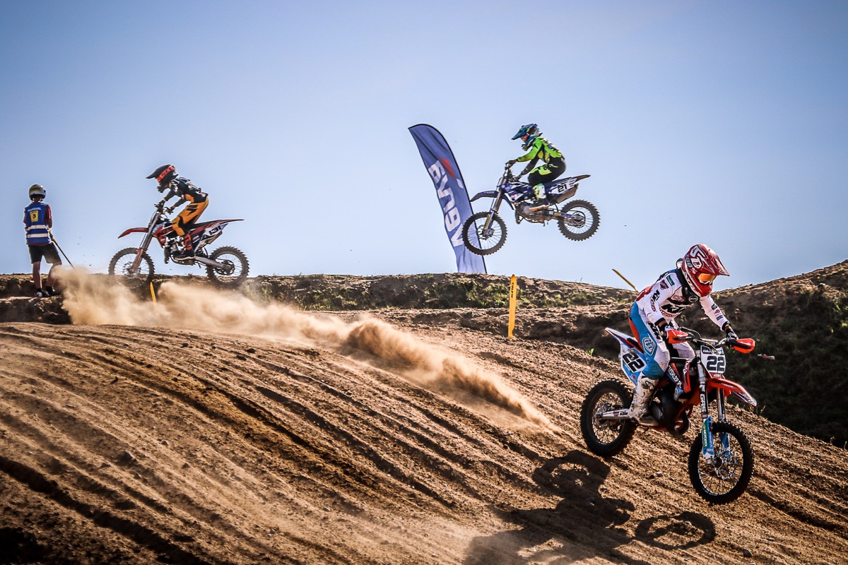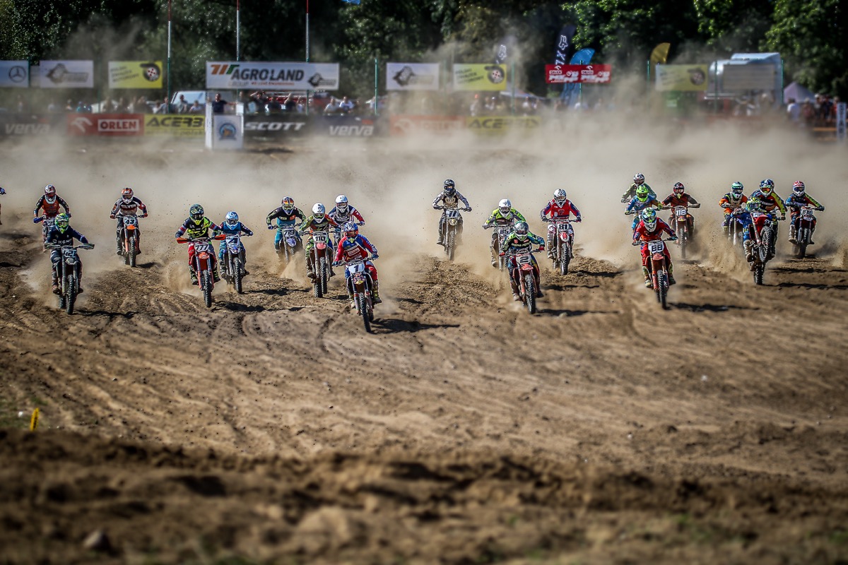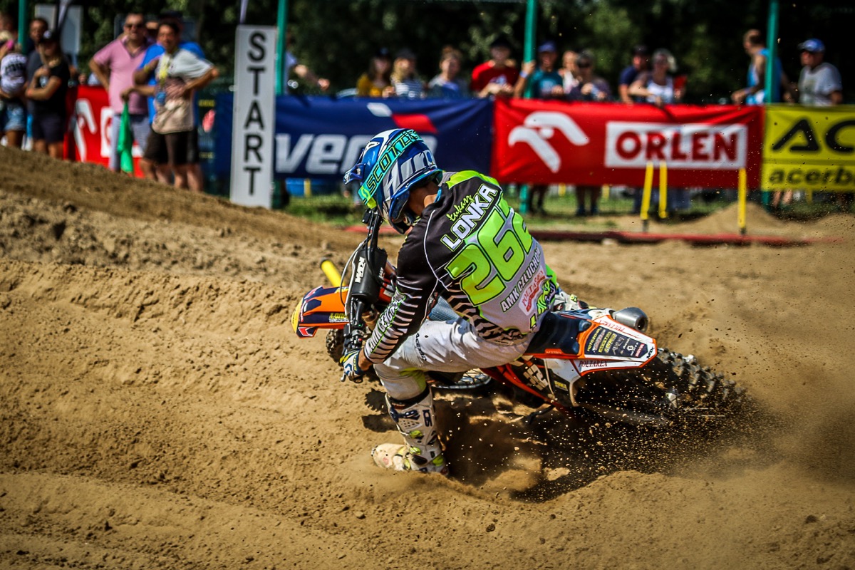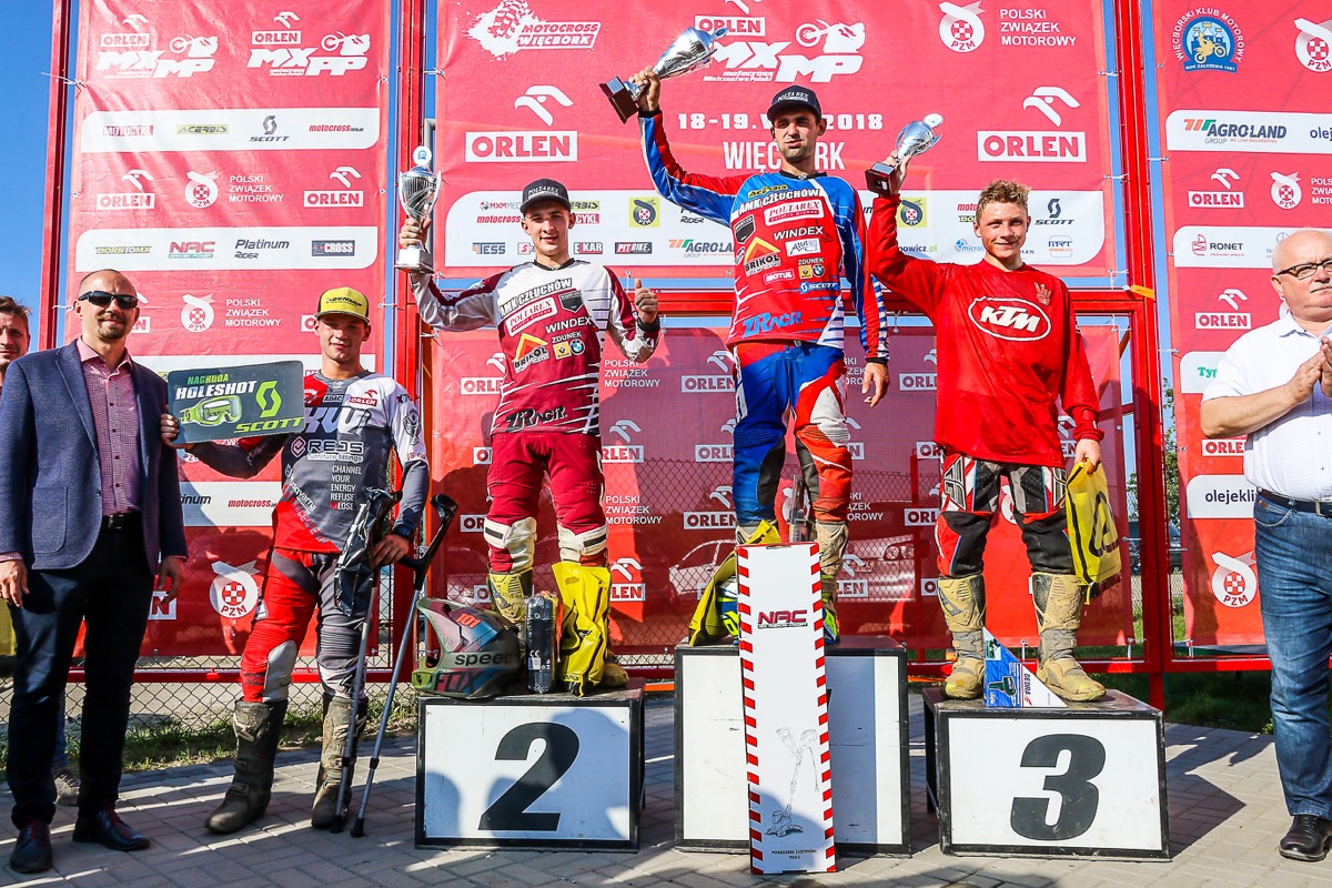 wiartce wysunął się na prowadzenie. Od początku nacierał na nich jednak również Łukasz Lonka, który również znalazł sposób na Kubę. Gdy udało mu się dopaść Szymona, Łukasz przewrócił się i ponownie musiał gonić uciekającego Staszkiewicza. Na ostatnich okrążeniach ponownie przeprowadził atak i tym razem dowiózł już pierwsze miejsce do mety. Szymon był drugi, a Kuba trzeci. Karol Kruszyński mimo, że spadał o kolejne pozycje, walczył do samego końca i ostatecznie przyjechał na 6. miejscu. W drugim wyścigu Łukasz Lonka nie bawił się już w kotka i myszkę ze swoimi rywalami. Od razu wysunął się na prowadzenie, które systematycznie powiększał. Ostatecznie zdublował wszystkich do piątego miejsca włącznie i z drugim kompletem punktów zwyciężył drugą klasę w Więcborku. Właśnie na piątym miejscu zameldował się Karol Kruszyński, który nawet mimo setki „zgarniętej” przez Lonkę, utrzymał prowadzenie w klasie MX 2. Drugi na mecie zameldował się Kuba Barczewski, który na tej pozycji zakończył całe zawody. Trzeci w wyścigu i trzeci w całych zawodach był 16-letni Artsiom Sazanovets, który coraz lepiej poczyna sobie również na czterosuwowej dwieście pięćdziesiątce w Polsce. Czwarte miejsce przypadło Łukaszowi Kędzierskiemu jadącemu na pożyczonym od Karoliny Jasińskiej motocyklu. We Wschowie okaże się, czy mimo poważnej kontuzji Karol zdoła utrzymać prowadzenie i zgarnąć swój pierwszy seniorski tytuł, czy to jednak Łukasz ponownie zostanie podwójnym Mistrzem…