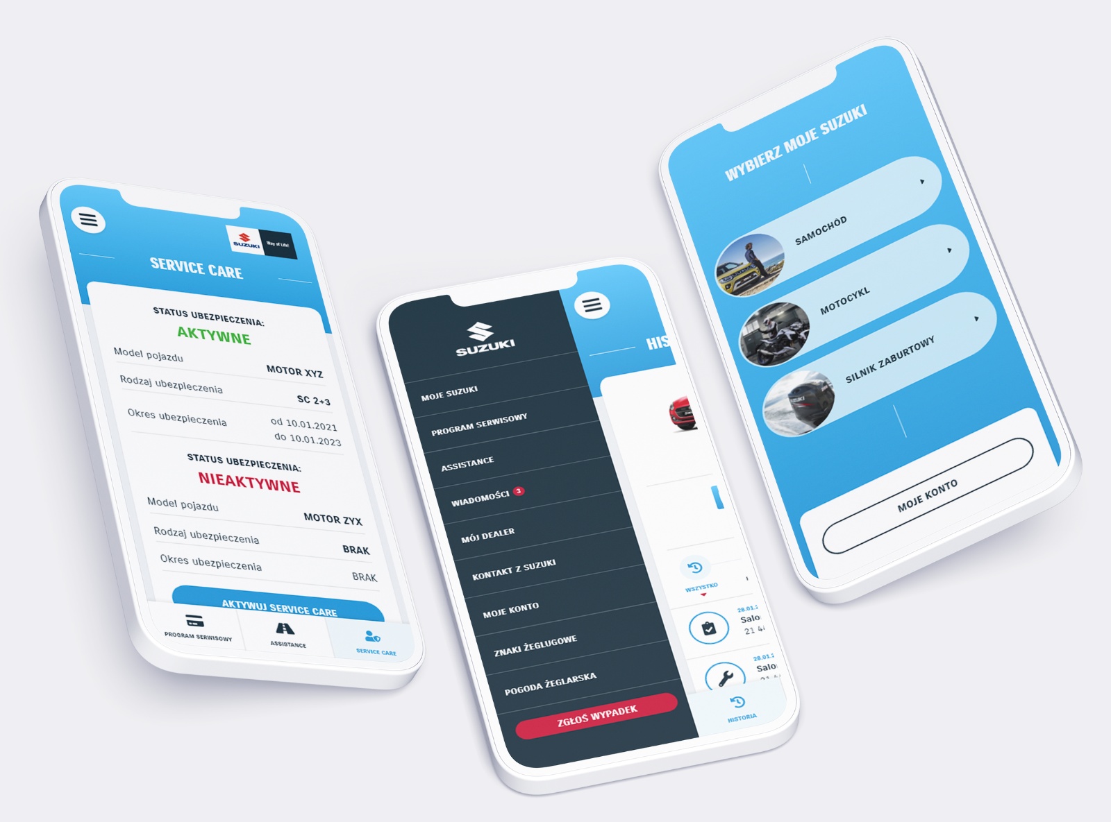 Zarejestrowany użytkownik może uzyskać dostęp do historii serwisowej pojazdu, statusu gwarancji fabrycznej, programu Service Care, a także sprawdzić datę ważności ubezpieczenia Suzuki Assistance oraz dostępne opcje pomocy.
