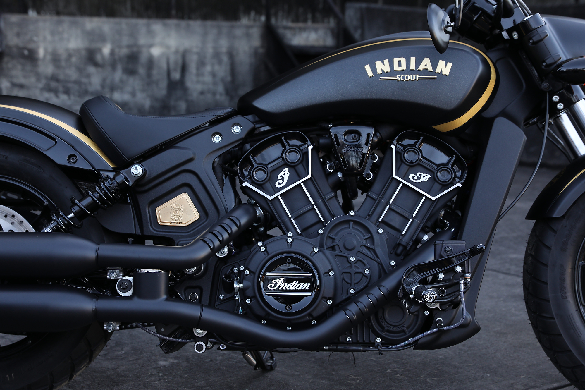Inne customowe detale obejmują kanapę z prawdziwej, perforowanej skóry, z obszyciem z logo Jack Daniel's, a także limitowane manetki, stopki i dźwignię zmiany biegów inspirowane znakowaniem marki „Old No. 7”. Wykończenie w połyskowym, wysokiej jakości lakierze na rozpórkach błotnika, rączkach, pokrywach zaworów silnika oraz na końcówkach wydechu, a także złocone logo Indian Scout jeszcze dobitniej podkreślają dbałość o szczegóły z jaką zaprojektowano tę limitowaną wersję.