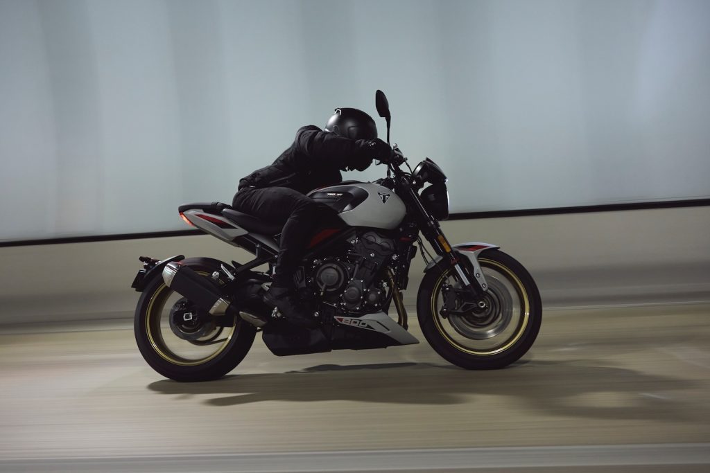 Sercem Tridenta jest responsywny, trzycylindrowy silnik o pojemności 798 cm³, mocy 115 KM i 84 Nm maksymalnego momentu obrotowego dostępnego przy 8 500 obr./min. Zapewnia on ekscytujące osiągi w realnych warunkach drogowych. Potrójna przepustnica gwarantuje błyskawiczną reakcję, a równomiernie rozwijany moment obrotowy w średnim zakresie obrotów i porywająca moc maksymalna sprawiają, że każda jazda staje się uzależniająca. Towarzyszy temu niepowtarzalne brzmienie trzycylindrowej jednostki Triumpha, wydobywające się z uniesionego, sportowego tłumika – dźwięk, który natychmiast przyspiesza bicie serca.