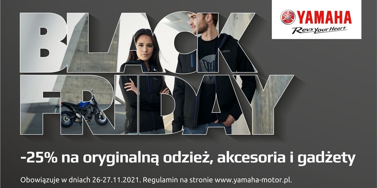 Nadchodzi długo wyczekiwany weekend zniżek! Salony Yamaha również wpisują się w tradycję Black Friday i w najbliższy piątek oraz sobotę (26-27 listopada 2021) przeceniają oryginalną odzież, akcesoria i gadżety aż o 25%! Tak wysokich rabatów jeszcze nie było!