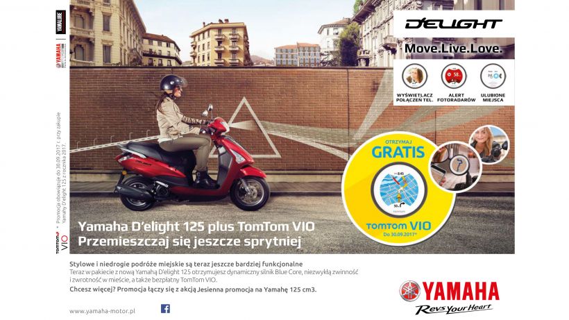 Każda osoba, która do końca września zdecyduje się na miejski skuter Yamaha D’elight z tego roku modelowego, w prezencie otrzyma dedykowany system nawigacyjny TomTom VIO. Dzięki TomTom VIO przemieszczanie się po mieście będzie jeszcze szybsze, sprytniejsze i wygodniejsze!