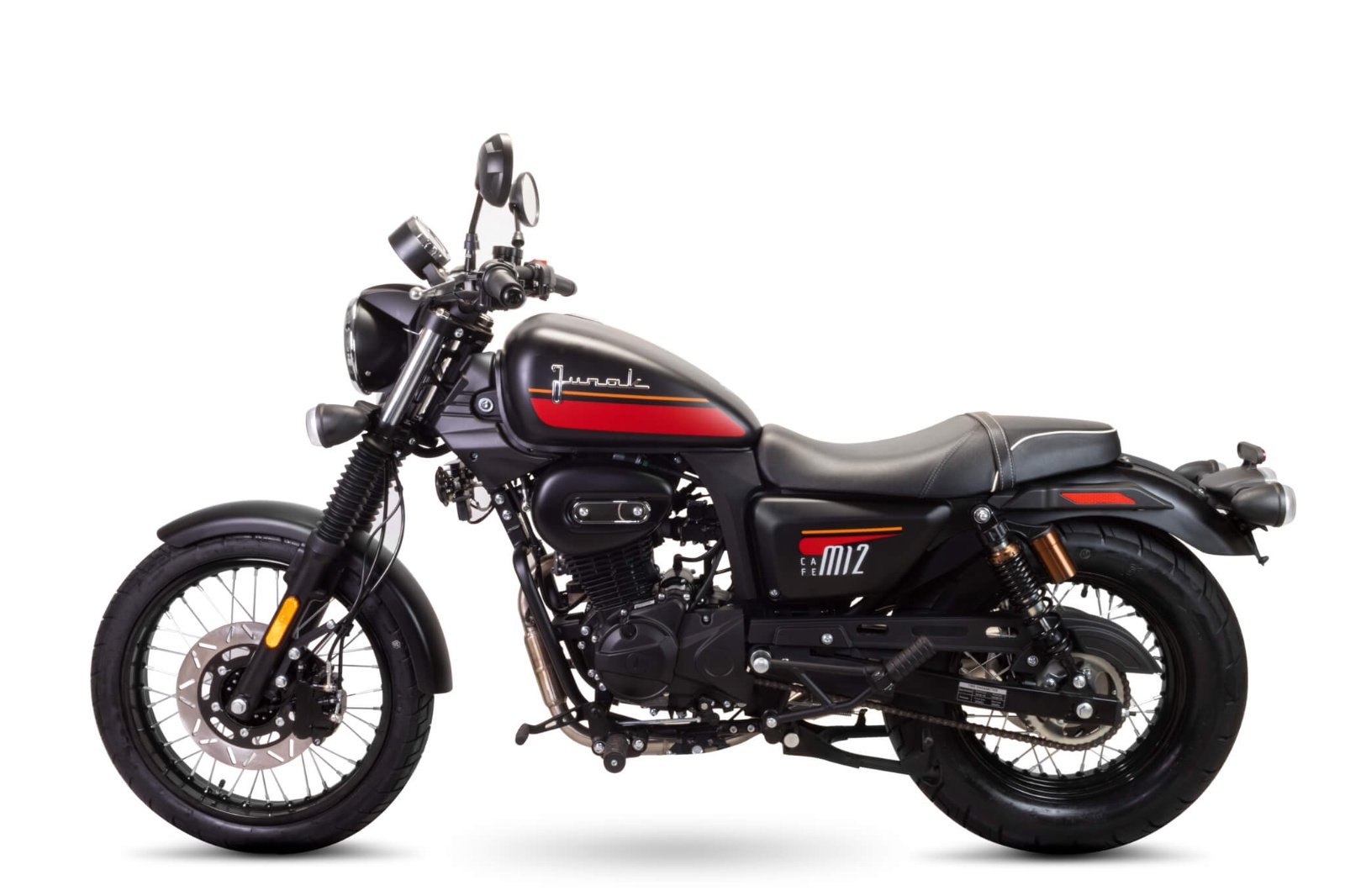 Sprawdzona i ceniona konstrukcja bazująca technicznie na odmianie M12 i M12 Vintage otrzymała wygodną kierownicę i bardzo fajną kanapę. Junak M12 Cafe tymi zabiegami stylistycznymi nawiązuje do bardzo klasycznych linii, a jednocześnie wyposażony został w nowoczesne rozwiązania techniczne w postaci komputerowego sterowania jednostką czy światła LED. Szkoda tylko, że Cafe nie ma tej samej jednostki napędowej, co inna nowość Junaka – SC, który dysponuje mocą pełnych 15 KM.
