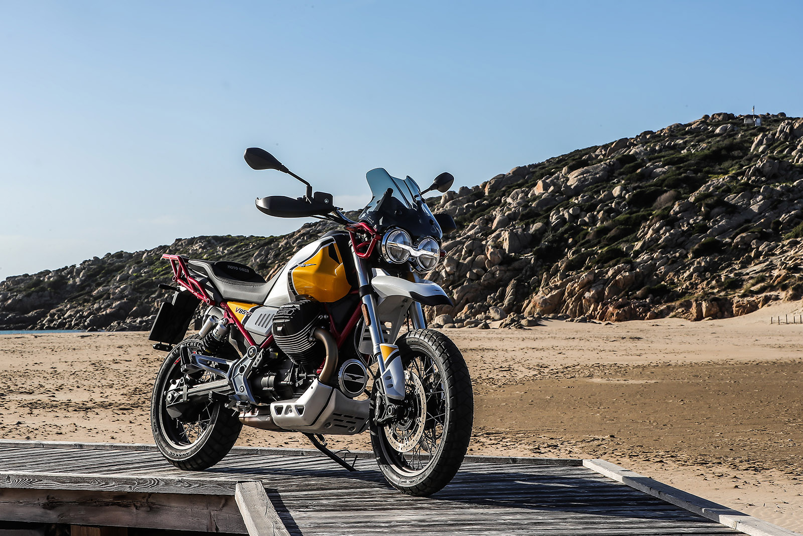 Zatankowany w 90% motocykl (zbiornik zmieści 23 litry paliwa) waży 229 kilogramów, silnik chłodzony olejem stanowi element nośny i usztywnia całą konstrukcję, a rama z rur stalowych nie tylko dobrze wygląda, ale i sprawia, że motocykl jest zwarty i chętnie poddaje się zachciankom kierowcy. Oczywiście znajdą się malkontenci i wymienią dziesiątki motocykli o lepszym prowadzeniu, ale dla nich mamy jedną odpowiedź: żaden z wymienionych nie będzie tak klasycznym turystycznym enduro! Silnik, pomimo niewygórowanych osiągów na papierze, jest zupełnie wystarczającym generatorem dobrych wrażeń zarówno na asfalcie, jak i po zjechaniu w delikatny teren. Zredukowanie mas wirujących o 30% skutkuje tym, że motocykl nie trzęsie się jak stara lodówka, a nowe tłoki, korby, tytanowe zawory ssące, przepustnica i pozostałe przerobione elementy w końcu pracują tak, że kultowe V2 w połączeniu z wałem kardana potrafi być całkiem dynamiczne.