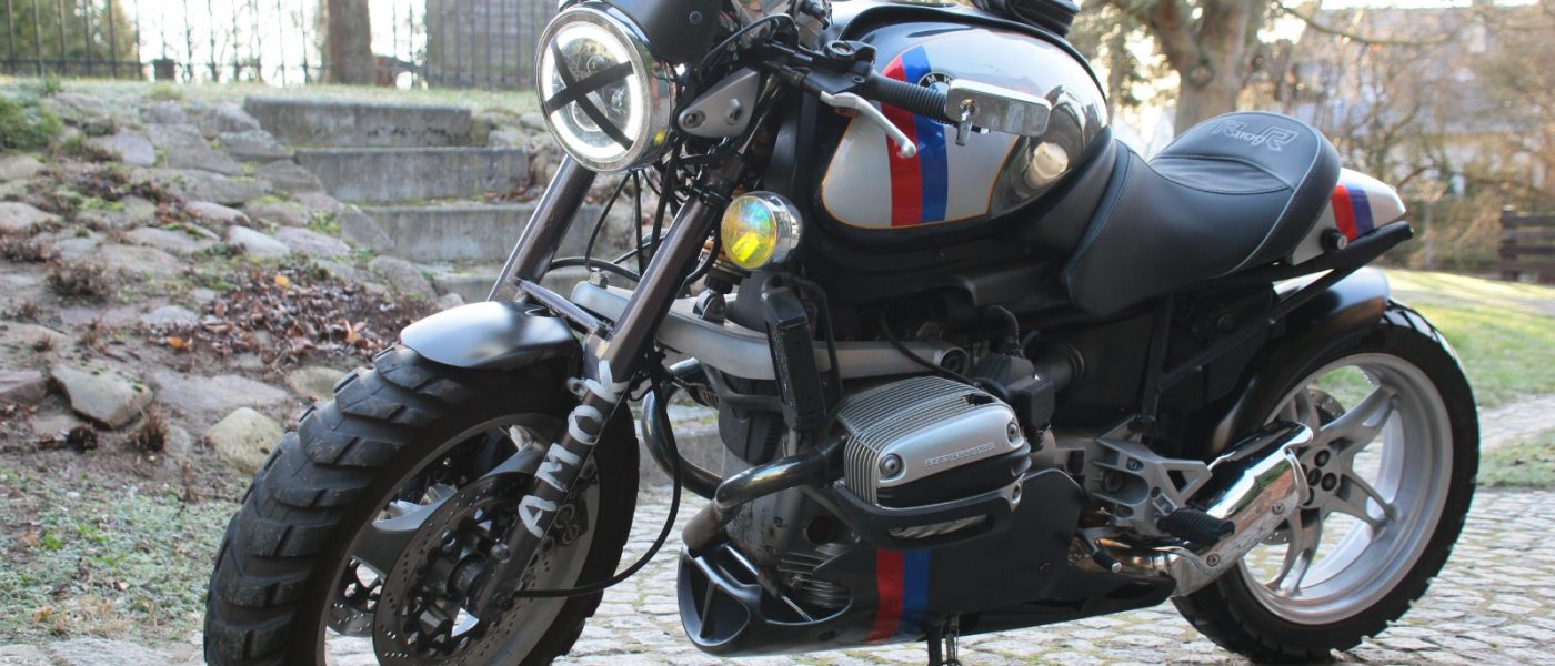 Skoro doszliśmy już do przerabiania motocykli, bo o tym głównie jest mowa, to jednak z biegiem czasu i po wielu obserwacjach wszechświata postanowiłem przerobić również ową nabytą beemkę. Zanim zabrałem się do rozbiórki, spędziłem wiele tygodni na śledzeniu różnych motocyklowych stron w necie i miałem już jakąś koncepcję. Na początek zabrałem się do zakupu lamp i kierunków, owiewkę dopasowałem od R nineT, zakupiłem nawet skórzany piórnik i sakwę boczną od H-D, ale w miarę upływu czasu i kolejnych przeróbek koncepcja się zmieniała.