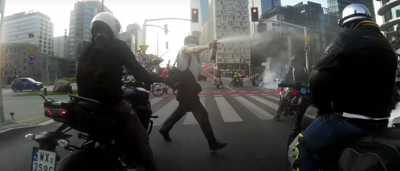 Wyobraźcie sobie, że jedziecie z grupą innych motocyklistów przez miasto, kulturalnie zatrzymujecie się na czerwonym świetle (no, z grubsza), a nagle przez pasy biegnie jakiś wariat i pryska wam w oczy gazem pieprzowym. To nie scena z GTA. To scena z Warszawy.