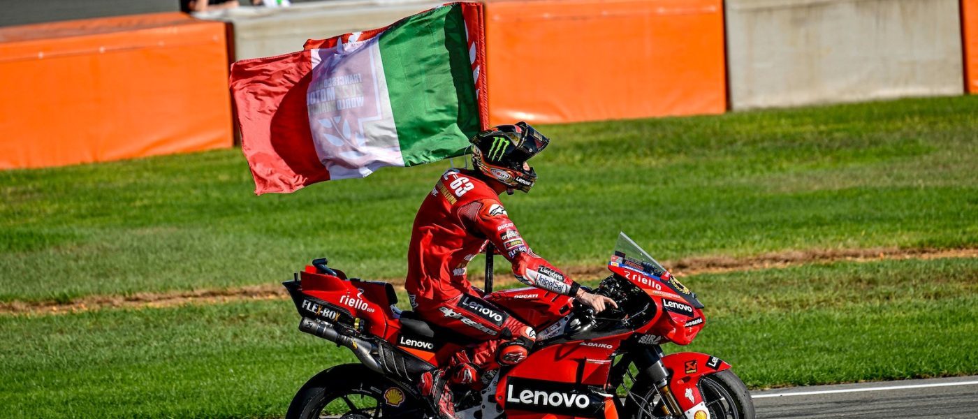 Z siedmioma zwycięstwami, dziesięcioma finiszami na podium i pięcioma pole position, Pecco Bagnaia wywalczył swój pierwszy tytuł mistrza świata. Przypieczętował go podczas finału sezonu w Walencji. Po drodze Bagnaia prowadził na 189 okrążeniach i zgarnął trzy najszybsze kółka w wyścigu. Włoch został zaledwie drugim zawodnikiem w historii, po Casey’u Stonerze w 2007 roku, który sięgnął po mistrzostwo na Ducati.
