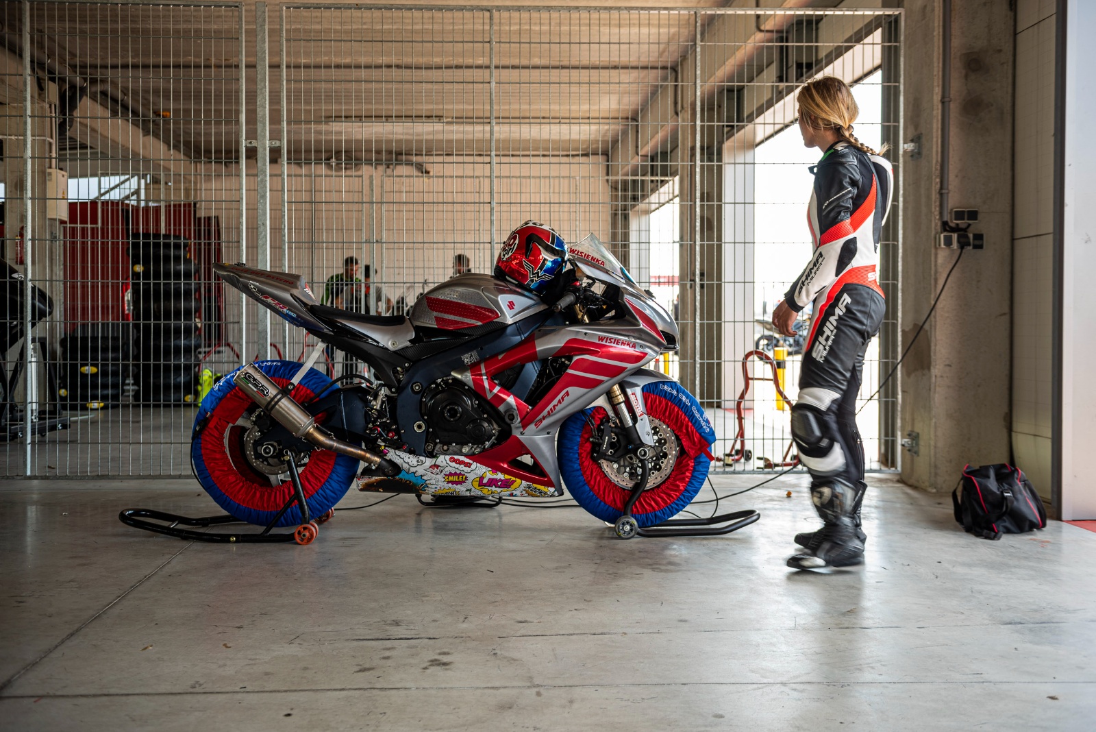 Motocykl wyprodukowano w roku 2010, a w ręce naszej kierowniczki trafił cztery lata temu. W teorii sprzęt był już torowy, bo miał wyścigowe owiewki. Zostały później polakierowane z jednej strony na srebrno, z drugiej na niebiesko ponieważ… Suzuki było kupione na spółkę z bratem. Pół było Agnieszki, a pół Michała. Na szczęście w międzyczasie Aga „spłaciła” brata, dzięki czemu z czystym sumieniem mogła go zgruzować. Nie brata, a motocykl. Zanim lot został dokonany, Suzuki przeszło kilka niewielkich zmian.