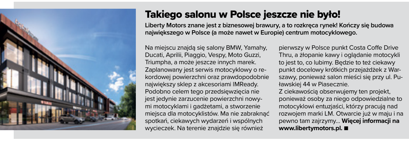 W aktualny numerze możecie przeczytać informację o budowie największego salonu motocyklowego w Polsce. Z rozpędu wymieniając marki, które odnajdziecie w Liberty Motors obok Yamahy, BMW, Ducati, Moto Guzzi, Aprilii i Vespy umieściliśmy… Triumpha.
