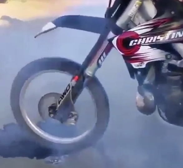 Na pewno ten niezbyt mądry sposób zabawy jest widowiskowy i bardzo ciekawy. Bo przecież wprawienie tylnego koła w obroty przy zatrzymanym motocyklu polega na odciążeniu tyłu i przeniesieniu dosłownie na chwilę masy na przód. Wtedy bezpiecznie zaczynamy palić gumę. Co w przypadku, gdy przednia oś jest napędzana? To na pewno wymaga kombinacji!