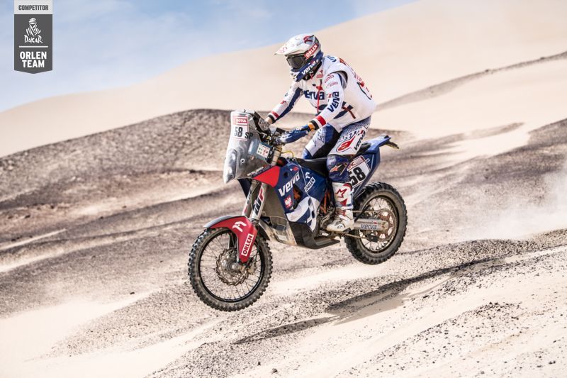 Wśród motocyklistów wielki sukces w karierze świętował Joan Barreda (Honda), który odniósł swoje 20. zwycięstwo etapowe na Dakarze. Hiszpan wygrał niedzielną próbę z ponadtrzyminutową przewagą nad Francuzem Adrienem Van Beverenem (Yamaha), który ponownie był drugi. Najszybszy ze stajni KTM okazał się Austriak Matthias Walkner – zdobył trzecie miejsce, tracąc ponad cztery i pół minuty. Maciek Giemza z ORLEN Team rozkręcał się z kilometra na kilometr i na kolejnych check pointach zajmował coraz lepsze miejsca. Ostatecznie uzyskał 34. czas. W klasyfikacji generalnej prowadzi Barreda przed Van Baverenem oraz Walknerem. Giemza awansował w generalce z 71. na 36. miejsce i traci do lidera 38 minut.
