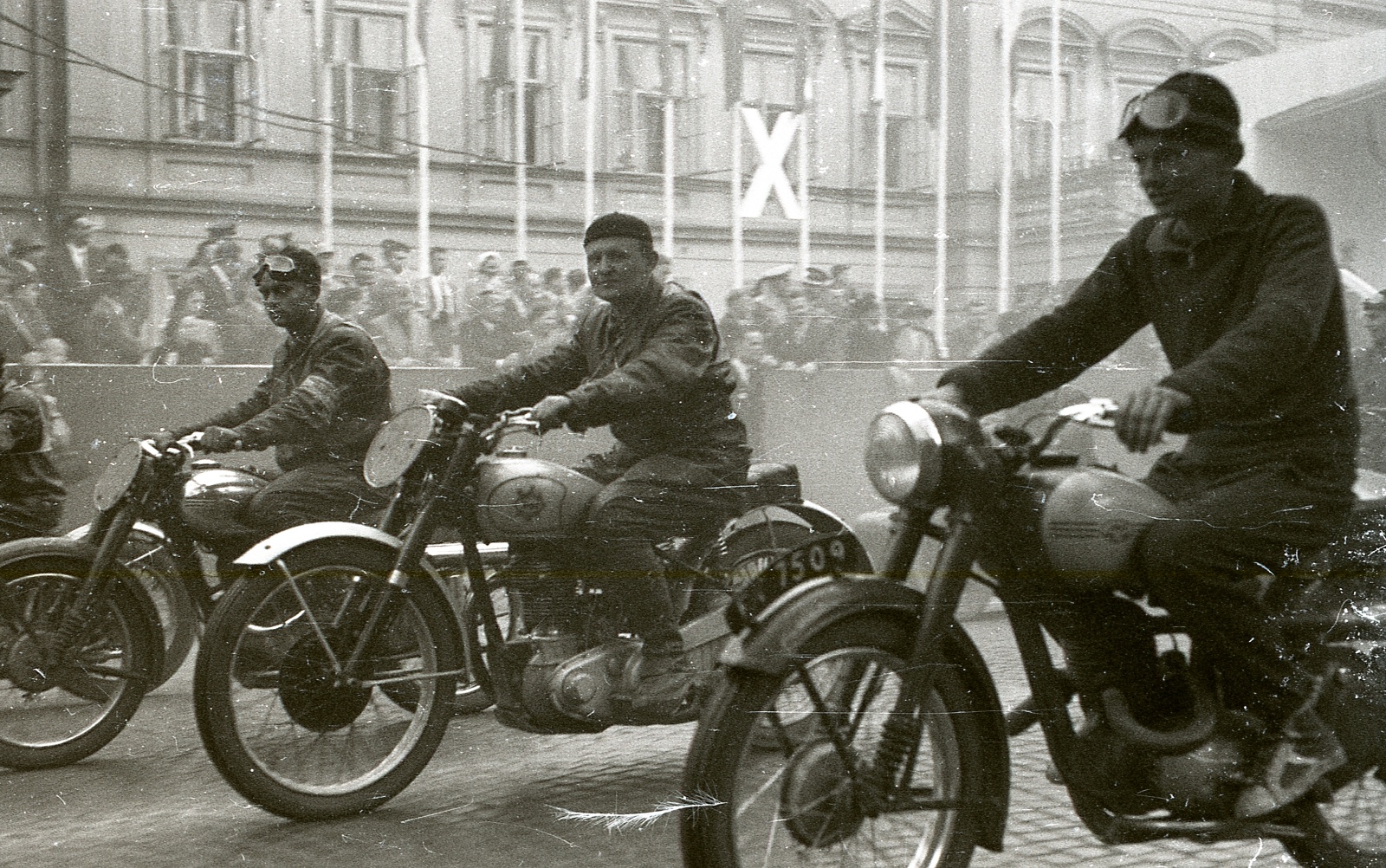Jan Kwaśniewski (w środku) na motocyklu BSA podczas defilady z okazji 10-lecia PRL. Lublin, 22 lipca 1954 roku