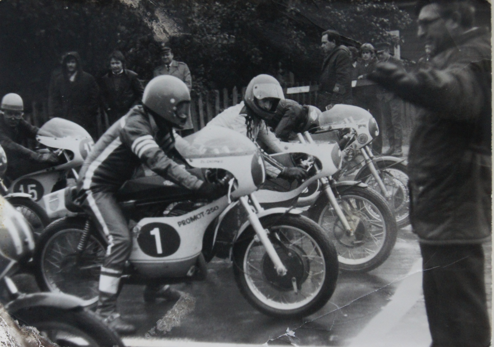 Start do jednego z wyścigów w latach 80. W pierwszym rzędzie trzy motocykle Promot 250
