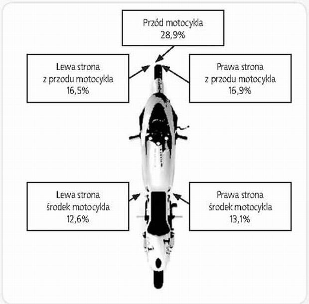 Minimalnie częściej notowane są wywrotki i zderzenia z prawą stroną motocykla -16,9%. Z lewej jest to 16,5%. Tylna część motocykla natomiast cierpi już zwykle zdecydowanie mniej.