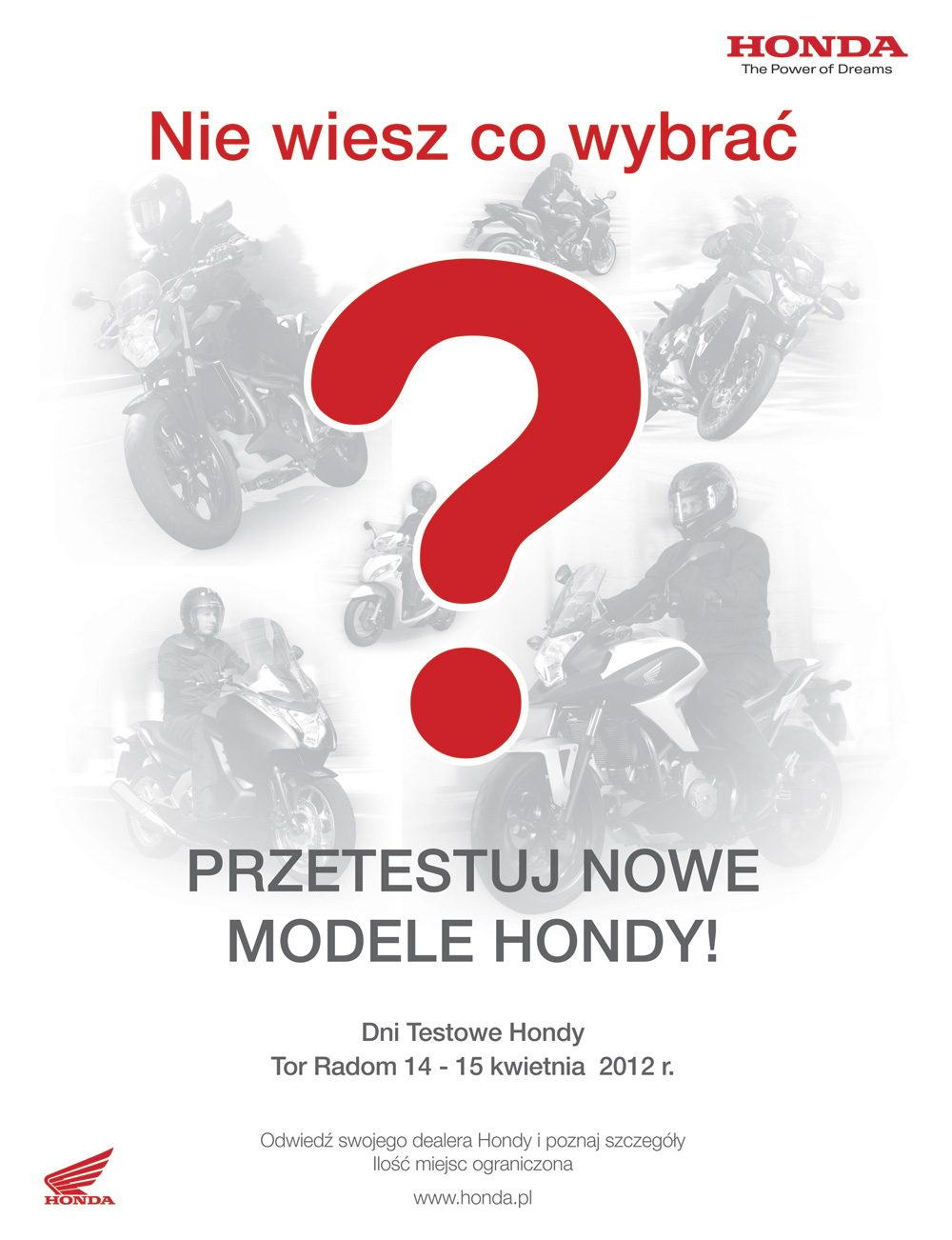 Koszt wpisowego to 200 zł, które zostanie zwrócone uczestnikowi w dowolnym autoryzowanym salonie w Polsce, jeżeli do końca kwietnia 2012 zdecyduje się na zakup nowego motocykla Hondy (niekoniecznie modelu testowanego w Radomiu).Osoby zainteresowane udziałem we wspomnianych dniach testowych zapraszamy do autoryzowanych dealerów motocyklowych Hondy, gdzie odbywają się zapisy. Liczy się kolejność zgłoszeń.