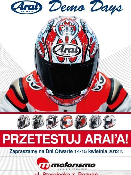 Z przyjemnością informujemy, iż dnia 14 i 15 kwietnia 2012 w godzinach od 10:00 do 17:00 w poznańskim salonie Motorismo będą się odbywały Arai Demo Days.