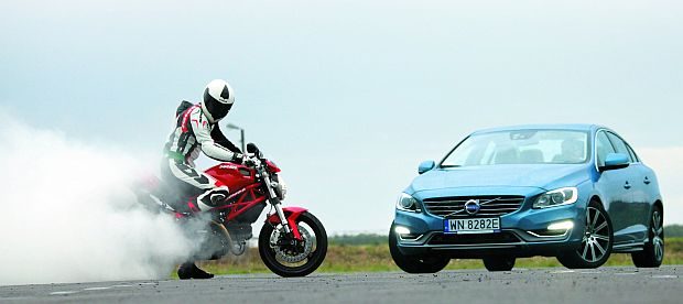 Po chwili wytchnienia w narożnikach przyszedł czas na rewanż. Nawierzchnię na prostej o długości około 800 metrów stanowią betonowe płyty poprzerastane trawą, a więc podłoże, któremu do ideału trochę brakuje. Zaglądając do danych technicznych można się przekonać o znacznej przewadze Monstera. Ducati na rozpędzenie od 0 do 100 km/h potrzebuje około czterech sekund, a Volvo – niespełna sześciu. Przewaga teoretyczna jest wyraźna, ale czy nie zostanie zniwelowana? Szwedzkie S60 dysponuje automatyczną skrzynią biegów i zaawansowanym systemem kontroli trakcji. Wystarczy wcisnąć pedał gazu i można mieć pewność, że katalogowy wynik zostanie osiągnięty.