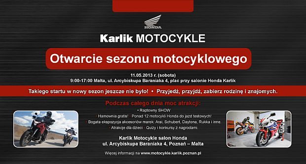 To już trzecia edycja otwarcia sezonu organizowana przez autoryzowanego dealera motocykli Honda w Poznaniu. W tym roku impreza ma formułę otwartego pikniku rodzinnego i zaplanowana jest w sobotę, tj. 11 maja 2013 r. w godzinach 9.00-17.00. Organizatorzy akcji zadbają przede wszystkim o bezpieczne przygotowanie motocyklistów do sezonu. Miłośnicy dwóch kółek, będą mieli możliwość darmowego sprawdzenia stanu technicznego motocykla. Specjalnie dla nich, przez cały dzień uruchomiona zostanie hamownia, obsługiwana przez wykwalifikowaną kadrę.