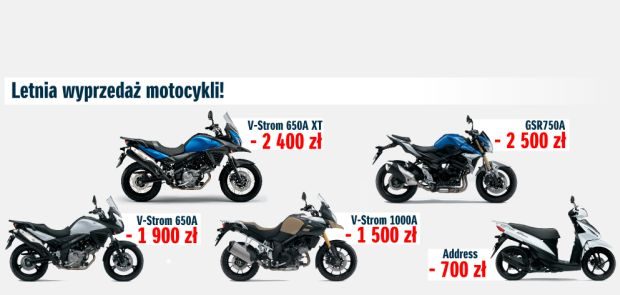 Motocykle V-Strom opracowano z myślą o maksymalnej radości, jakiej może dostarczyć długa podróż na bardzo uniwersalnym, wygodnym i przyjaznym motocyklu. Podstawowy model V-Strom 650 zdobył już reputację wspaniałego motocykla turystycznego, a teraz dostępny jest z rabatem 1900zł – w cenie 30 000. Wersja XT, wyceniona po rabacie na 31 500 zł, dodaje do niego szprychowe koła z aluminiowymi obręczami, bardziej „przygodową„ stylizacje i szerszą gamę przydatnych akcesoriów.