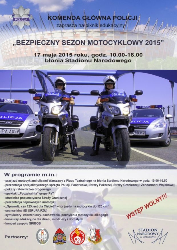 Uroczystym rozpoczęciem pikniku będzie przejazd motocyklami z Placu Teatralnego pod Stadion Narodowy, w którym wezmą udział m.in. policjanci ruchu drogowego z całej Polski. Przejazd odbędzie sie ulicami: Pl. Teatralny, Wierzbowa, Pl. Piłsudskiego, Królewska, Marszałkowska, Rondo Romana Dmowskiego, Al. Jerozolimskie, Rondo de Gaulle’a, Al. Poniatowskiego, Wyb. Szczecińskie, Siwca, Błonie Stadionu Narodowego. Zbiórka motocyklistów o godz. 10.00.