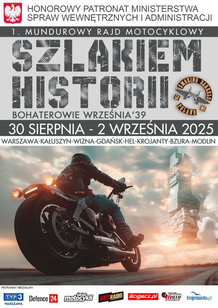 30 sierpnia br. o godz. 10.00 przed Grobem Nieznanego Żołnierza w Warszawie rozpocznie się 1. Mundurowy Rajd Motocyklowy „Szlakiem Historii – Bohaterowie ‘39”. Kilkudziesięciu motocyklistów wyruszy w trasę śladami największych bitew września 1939 roku. Na trasie o dystansie blisko 1500km zatrzymają się min. w okolicach Kałuszyna, Wizny, Trójmiasta, Krojantów i Bzury. Oddadzą hołd Polakom heroicznie walczącym w pierwszych dniach II wojny światowej.