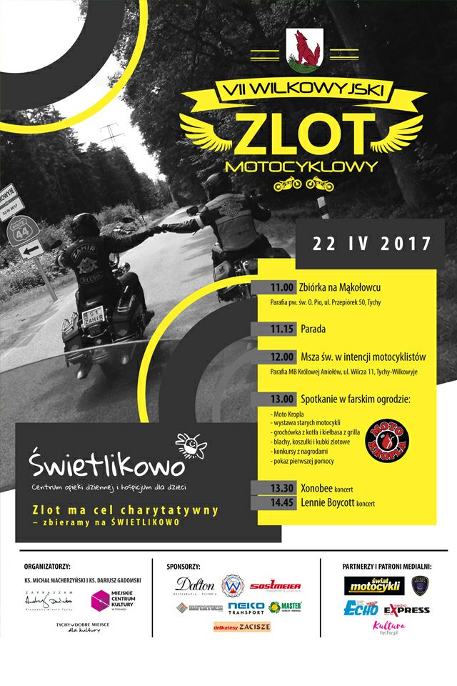 Duża w tym zasługa licznych atrakcji, takich jak koncerty, konkursy z nagrodami no i oczywiście przyjacielskiej atmosfery podczas biesiady w ogrodzie farskim. Wielu motocyklistów i motocyklistek doświadczyło już wyjątkowej atmosfery Wilkowyjskich Zlotów i wracają tu co roku. W tym roku powód do przybycia na imprezę jest jeszcze jeden, bowiem na miejscu będą zbierane pieniądze na budowę Świetlikowa, pierwszego w Polsce Centrum Opieki Dziennej dla Nieuleczalnie Chorych Dzieci. Dlatego cieszymy się, że nasza redakcja została patronem medialnym tego wydarzenia.