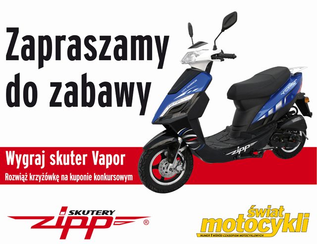 Aby wziąć udział w konkursie i wygrać skuter Zipp Vapor, należy podczas trwania wystawy wypełnić kupon konkursowy dostępny na stoisku Świata Motocykli i oddać go do godziny 15.00 dnia 4.03.2012. To proste. Kupon wystarczy uzupełnić rozwiązując krzyżówkę i wpisując wymyślone skuterowe hasło reklamowe, zawierające wyraz będący rozwiązaniem krzyżówki. Zwycięzca konkursu zostanie ogłoszony po godz 15.00