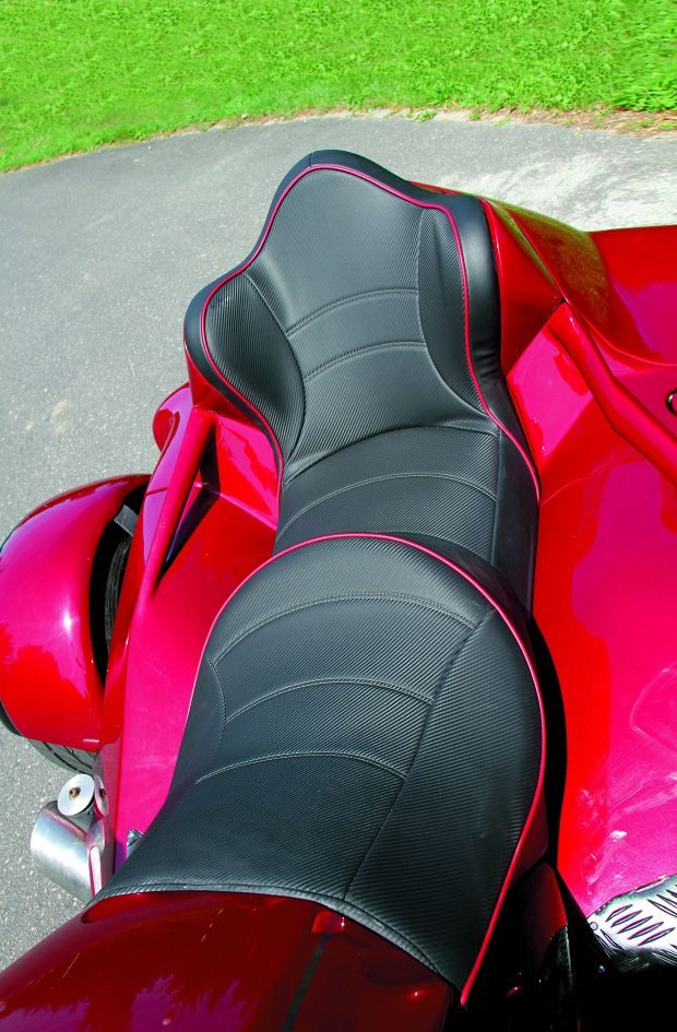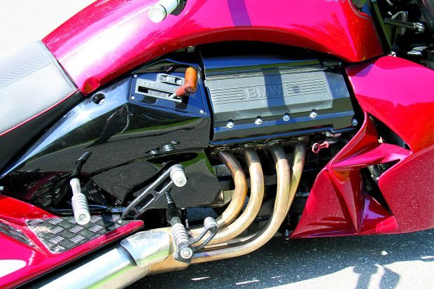 Wał napędowy również pochodzi z BMW, ale został odpowiednio skrócony. Na tylnej osi spoczywają stalowe, 17-calowe felgi, poszerzone do rozmiaru 12 cali. Obuto je w opony 285/40. Przednie, 16-calowe koło wykonano z dwóch samochodowych felg. Spoczywa na nim motocyklowa opona o szerokości 240 mm. Zgrabna karoseria pokrywająca stalowy szkielet jest z laminatu. W tylnej części wygospodarowano spory bagażnik. Elegancką, dwuosobową kanapę z oparciem dla pasażera wykonał Robert, a ostateczny szlif w postaci obszycia skórą nadał kolega Andrzeja z Poznania.