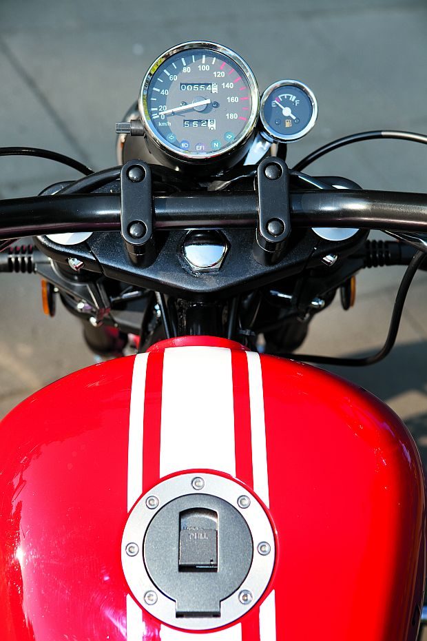 Koła, rama, kierownica M16 – to wszystko tworzy zwartą bryłę i dopiero po czasie widać, że zamiast kultowego silnika V2 w ramie tkwi R2. Siedzi się nisko, w lusterkach wszystko widać, kąty ugięcia kierownicy i umiejscowienie stopek są wygodne. Mamy poczucie kontroli nad motocyklem dzięki bardzo niskiemu środkowi ciężkości. Ale to już chyba wszystkie jego zalety.
