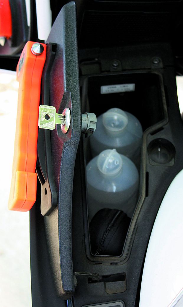 W fabrycznym schowku w owiewce Hondy ST 1300 Pan European idealnie mieszczą się dwa pojemniki z płynami fizjologicznymi, natomiast na klapce zamykającej schowek zamocowany został podręczny młotek bezpieczeństwa. W zamkach wszystkich kufrów są już umieszczone kluczyki, co umożliwia natychmiastowy dostęp do ich zawartości po dotarciu do poszkodowanych.