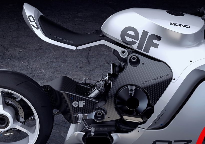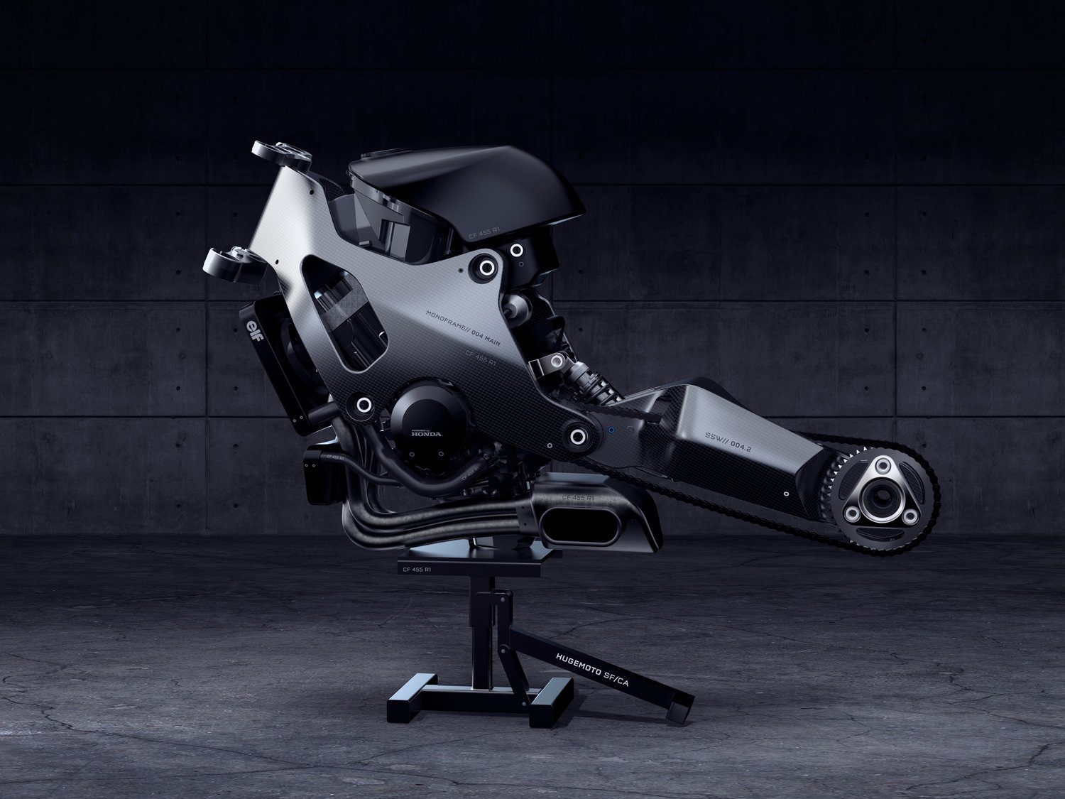 Jeden z wiodących inżynierów, należących do grupy Hugemoto, Allan Reich stworzył ramę główną i wahacz jako jedną spójną część, wykonaną na bazie konstrukcji karbonowej, w celu obniżenia wagi, a co za tym idzie, zwiększenia osiągów motocykla.