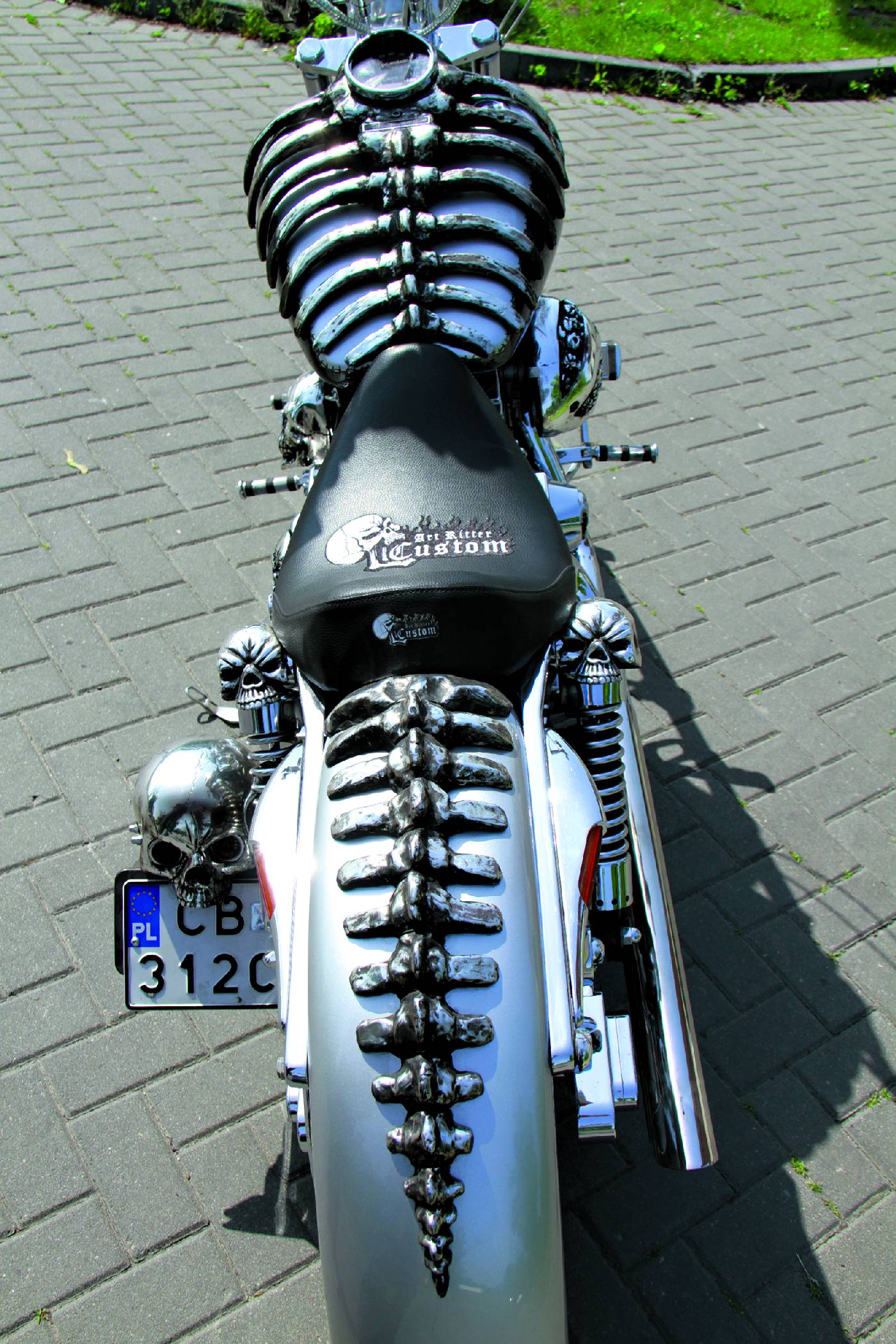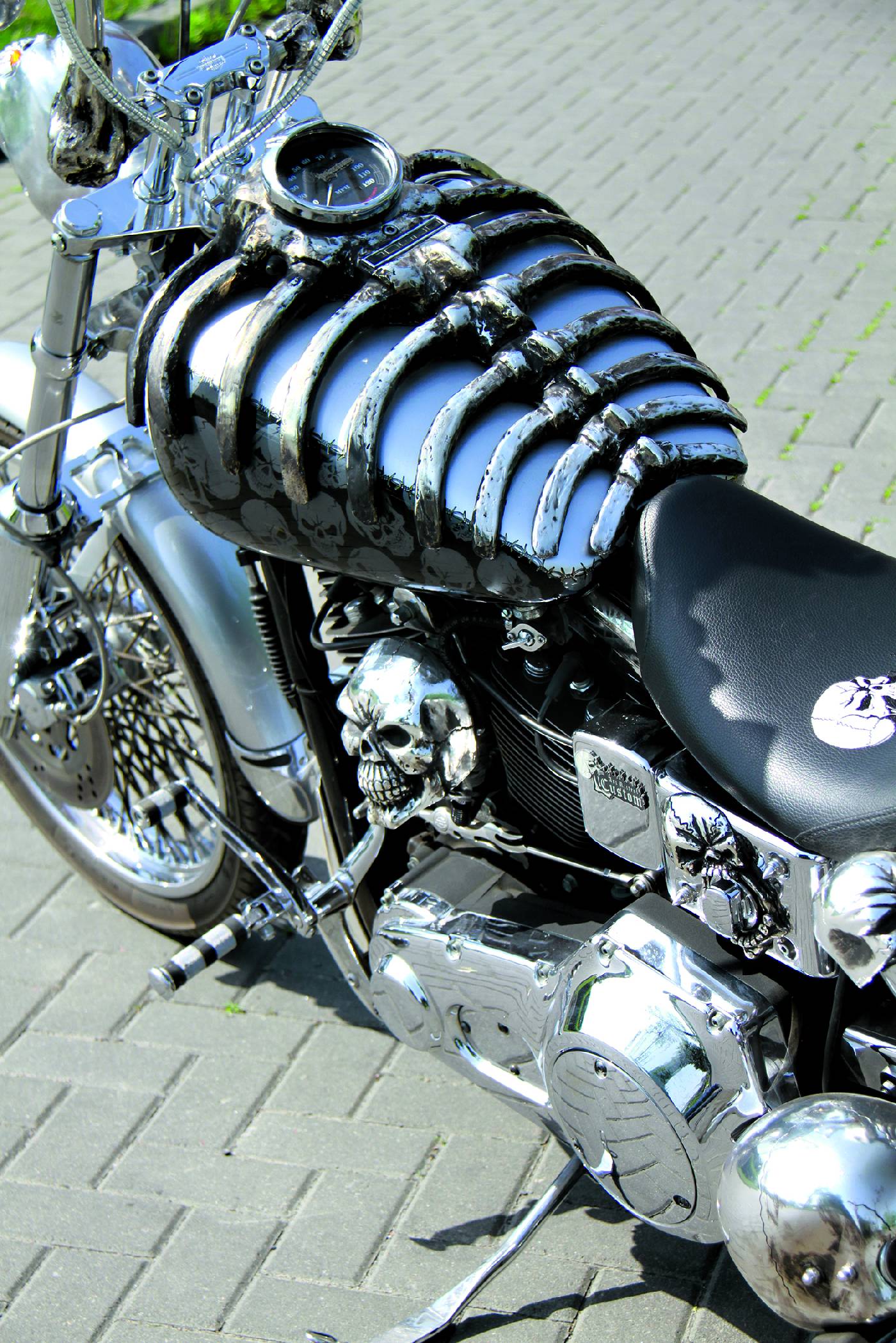 skonale tu pasuje, bo maszyna ma grzbiet w postaci metalicznie połyskującego kręgosłupa wraz z żebrami, ciągnącego się od baku aż po tylny błotnik. Uzupełnieniem trójwymiarowych motywów są całe konstelacje czaszek wymalowane na karoserii.