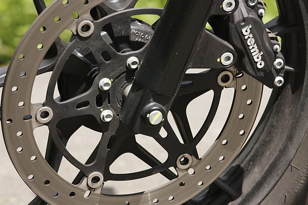Układ hamulcowy jest prosty, lecz skuteczny. Pojedyncza, ale solidnych rozmiarów (320 mm) tarcza hamulcowa z zaciskami Brembo całkowicie wystarczająco spełnia swoje zadanie. Jak się okazuje, przy lekkim motocyklu żadne radialne monoblocki nie są konieczne.