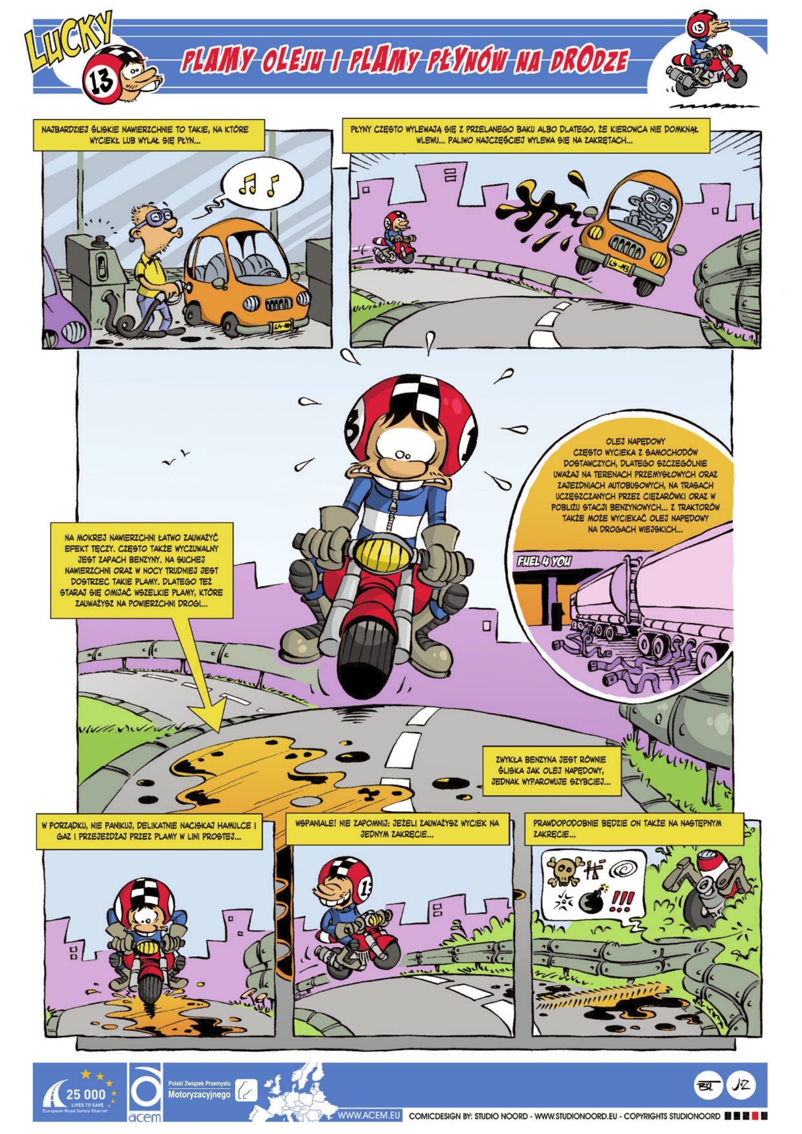 W dzisiejszych czasach coraz częściej obserwujemy tendencje spadkowe w zakresie zainteresowania ogólnie pojętą literatura w tym również tą dla motocyklistów. Jest ona wyparta przez telewizję czy Internet, w którym znajdujemy tak wiele wideoblogów czy wideoporadników o tym, jak zachowywać się na drodze. Na szczęście po piętach depcze im komiks, który od tylu lat nie traci na swojej popularności. Stowarzyszenie Europejskich Producentów Motocykli wykorzystując tę wiedzę przygotowało kampanie „Lacky 13”.