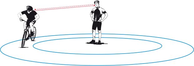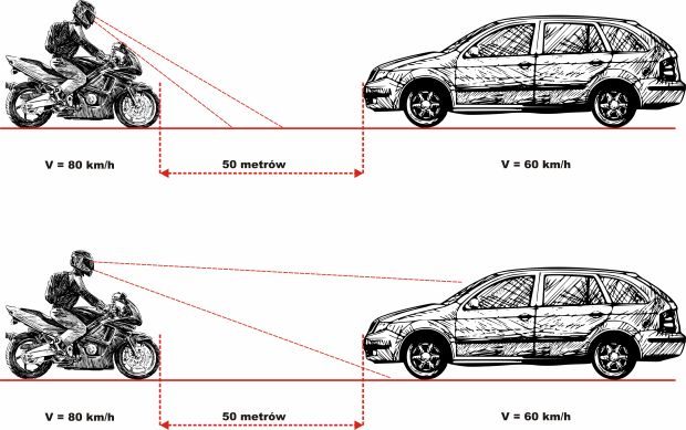 Jeśli utrzymasz swój tor jazdy, znajdziesz się z nim na linii kolizyjnej. Jeśli prędkość motocykla to 80 km/h a samochodu – 60 km/h, dzielące je 50 m pokonają w ok. 1,3 s. Tylko wzrok skierowany w dal pozwoli od razu zareagować na zagrożenie.