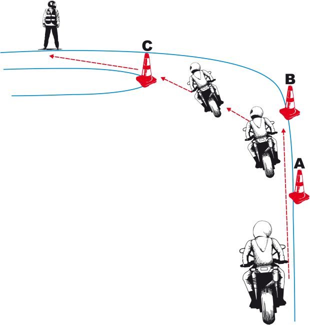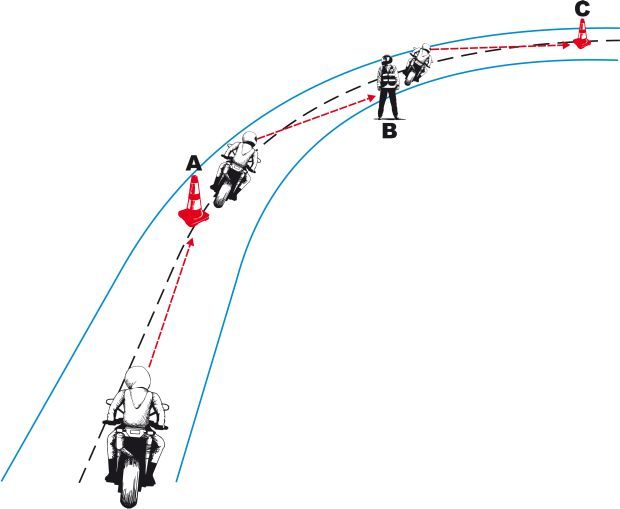 To ćwiczenie ma trzy etapy: I – Twój wzrok ma być skierowany na słupek z literą B, tak jak pokazują strzałki; II – kiedy motocyklem mijasz słupek z literą A, wzrok ma być już skierowany na słupek C; III – kiedy dojedziesz do słupka B, masz obserwować osobę w miejscu D. Pomocnik, kiedy zobaczy, że dojechałeś do słupka B, podnosi raz lewą, raz prawą rękę. Po próbie pyta motocyklistę, ile razy widział podniesioną lewą i prawą rękę. Prawidłowe odpowiedzi oznaczają, że motocyklista miał wzrok stale skierowany we właściwe miejsce. Błędna odpowiedź oznacza, że jego wzrok „uciekał”. Ćwiczenie będzie wykonane prawidłowo, kiedy motocyklista przy 10 takich próbach nie pomyli się.