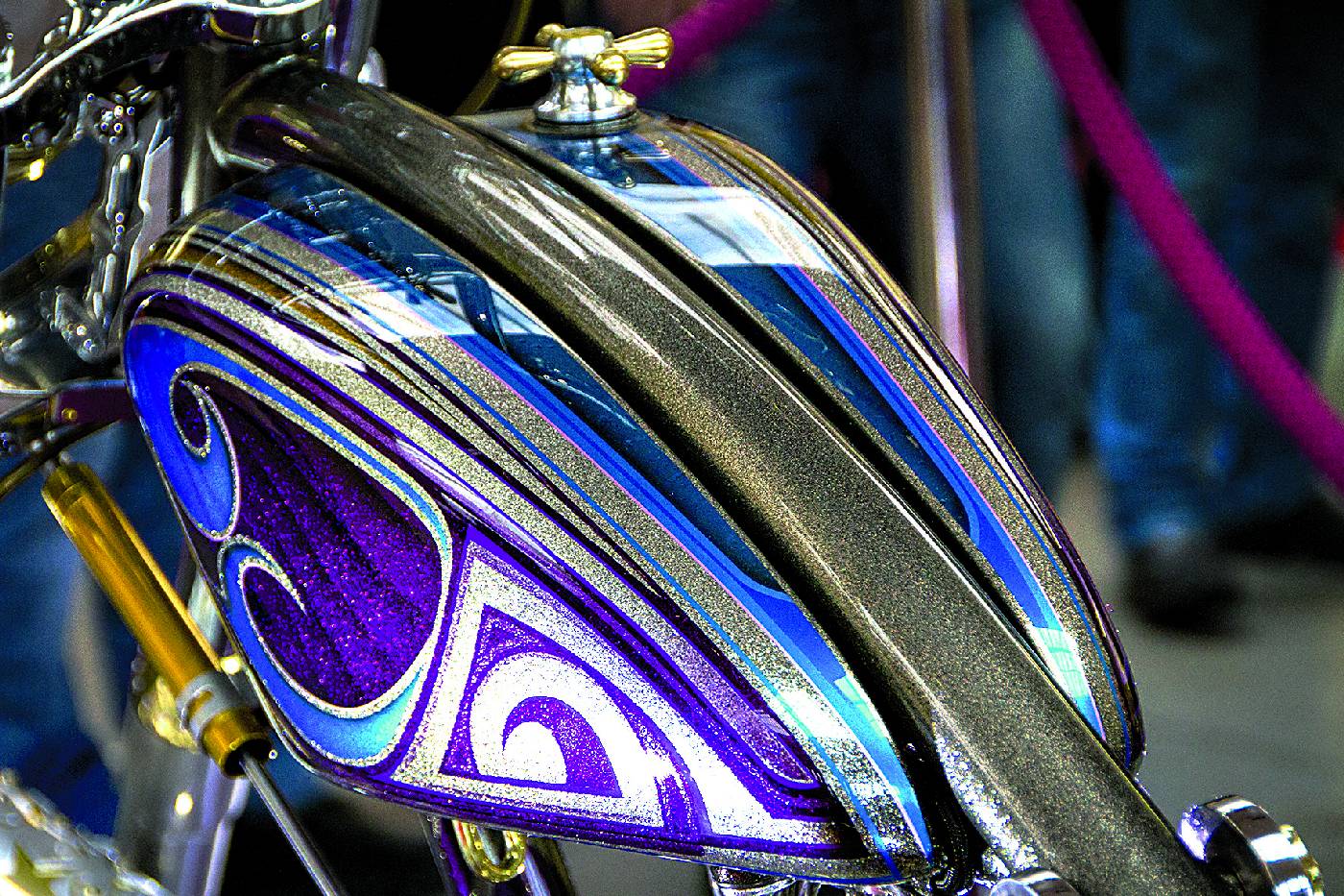 Gdy sylwetka motocykla była już gotowa, zacząłem myśleć, kto go pomaluje. Nie zastanawiając się długo, doszedłem do wniosku, że najbardziej odpowiednią osobą będzie Piotrek Parczewski z Elbląga (jego dzieła można obejrzeć na www.aerograf.com.pl). Niejednokrotnie rozmawialiśmy o wspólnych projektach, które jednak dotąd nie miały szansy realizacji. Zadzwoniłem do niego, opowiedziałem całą historię, przesłałem zdjęcia z budowy mojego sprzętu i powiedziałem: „Marzą mi się trzy kolory: fiolet, złoty i srebrny, na resztę daję Ci wolną rękę”. Efekt malowania był oszałamiający. Pomysł Piotrka w stu procentach wstrzelił się w mój gust. To była naprawdę świetna robota.