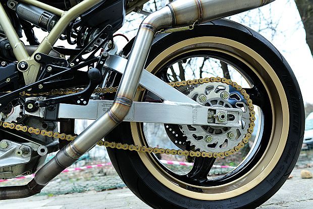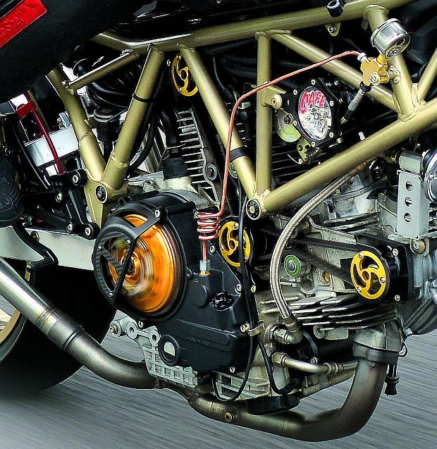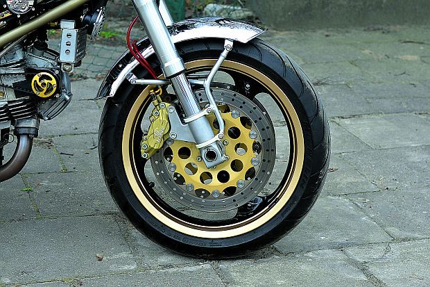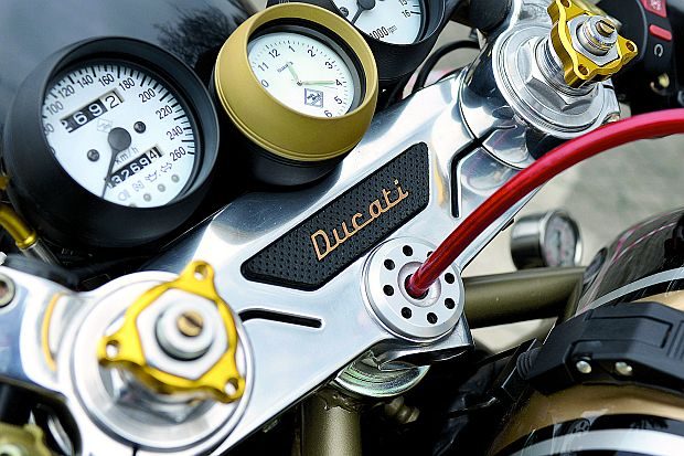 W oryginale 900SS niemal wszystko ukryte było pod wielkimi połaciami aerodynamicznych osłon. Tu każdy element stanowi jakiś detal budujący ogólny wizerunek motocykla. Całości dopełnia stal, aluminium, chrom, czerń, złoto i subtelna grafika.